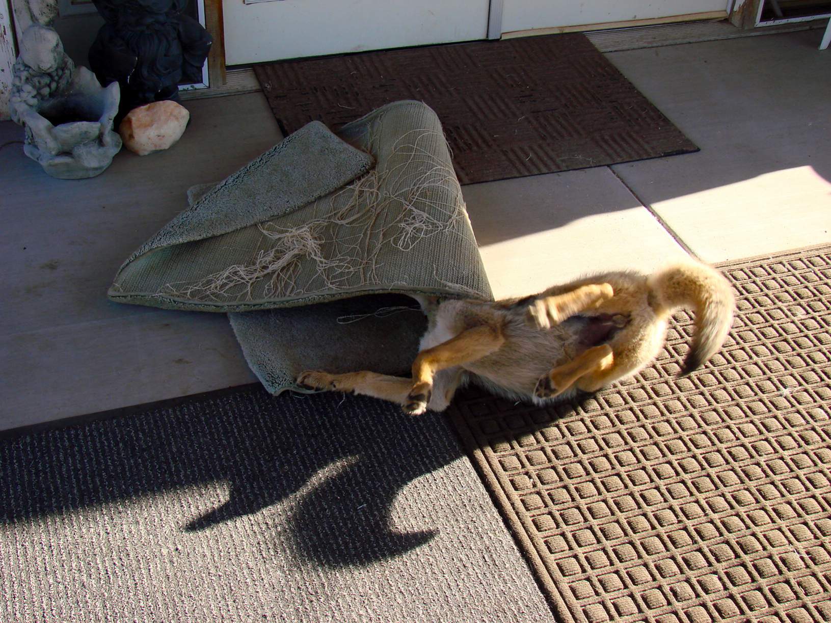 Our other two dogs are very domesticated and they play with each other a lot, but they have never figured out a viable game with our cat. Same with Sandy. All the dogs know dog games, dog communication techniques and dog interests. The coyote fits in with the domestic dogs as well as any other dog. Even better than most with Bei Bei as she has mothered her, been her pal, kept her cleaned up, wakes her up in the morning if we ask her to and on and on. True pack members and playmates. But Sandy, as with the other two, can't figure out a workable game with the cat.