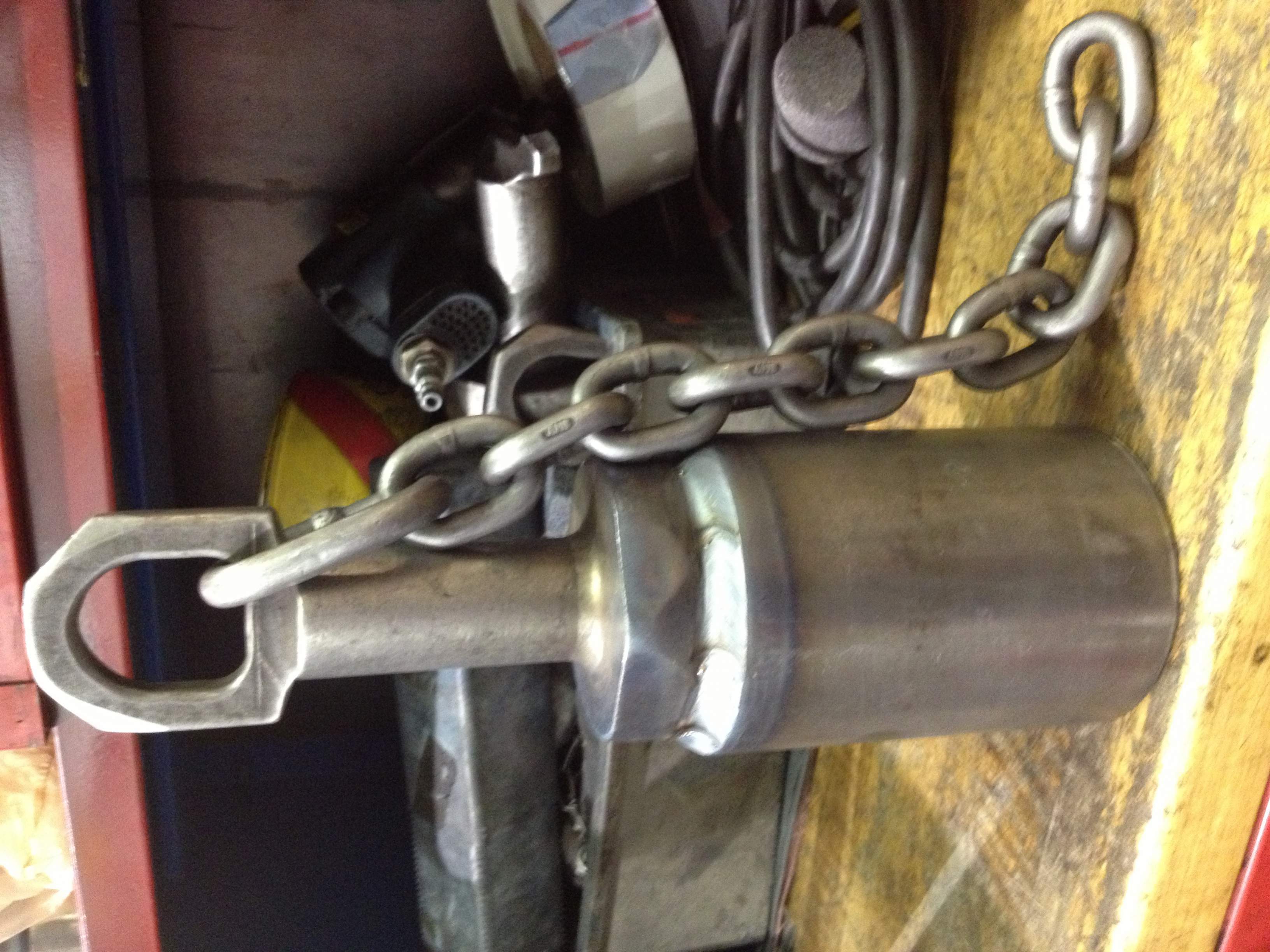 Here's the mole I'm gonna try to pull with it. I still have to grind an angle on it and short'n up the chain some but here it is. It was used to lift big parallels at work, someone busted the chain on the other side so they threw them away. I went to the welder and had him attach a plug on the end of it. Sorry, I tried to shrink the pictures and rotate them but I don't know how to do that. I can barely make this thing work sometimes.