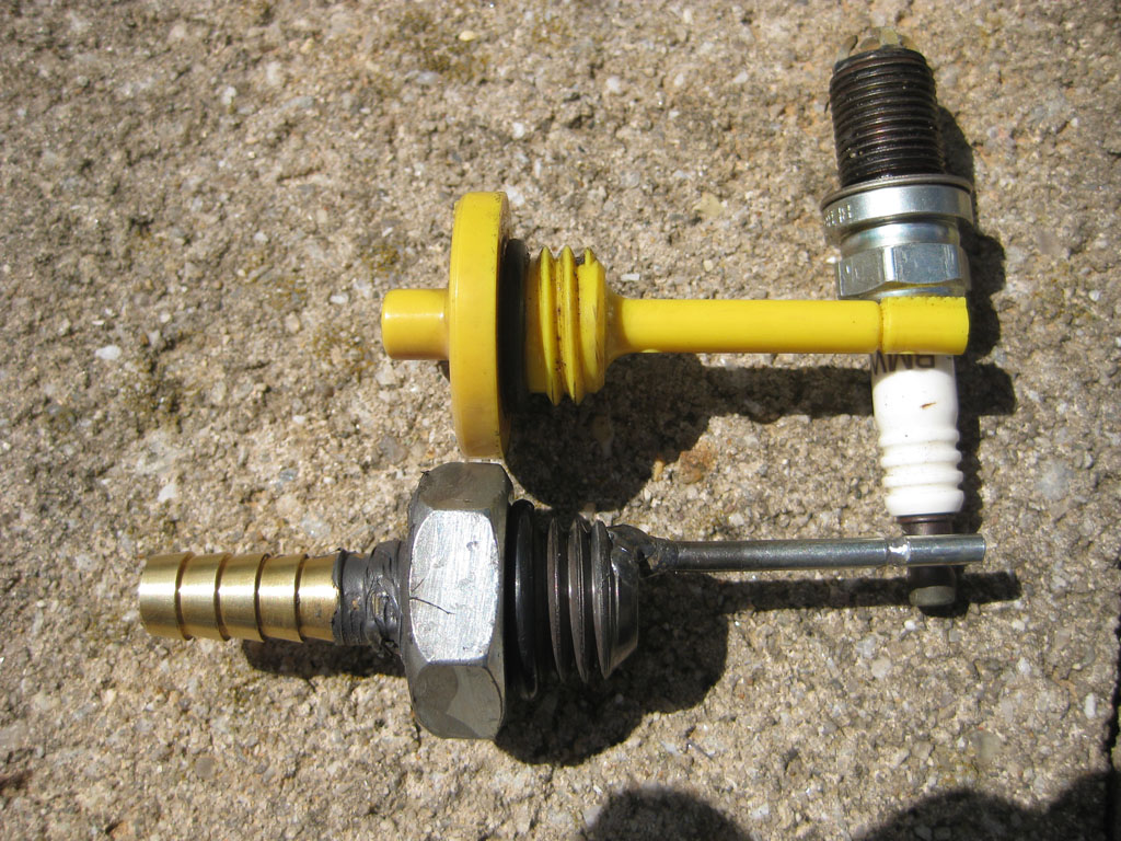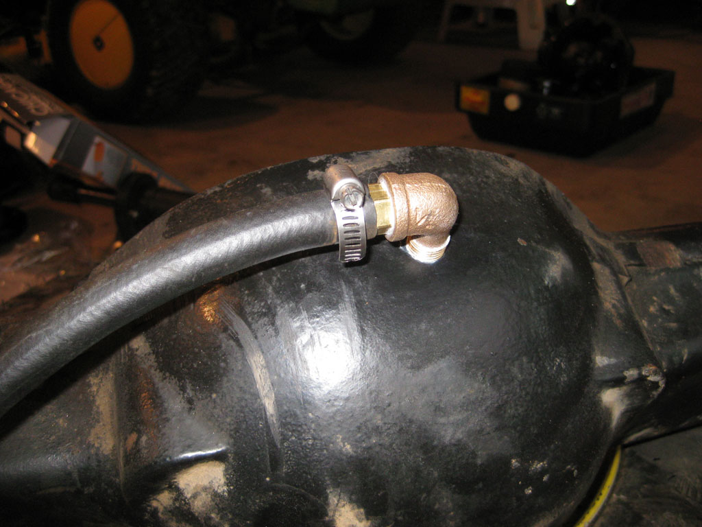 Its a 1/4"NPT 3/8" barb screwed to a 1/4"NPT elbow. Since the spinning parts of the engine are right above the vent I want to get the vent hose out of the way the easiest way possible. Instead of bending the hose, we bend the hard parts.