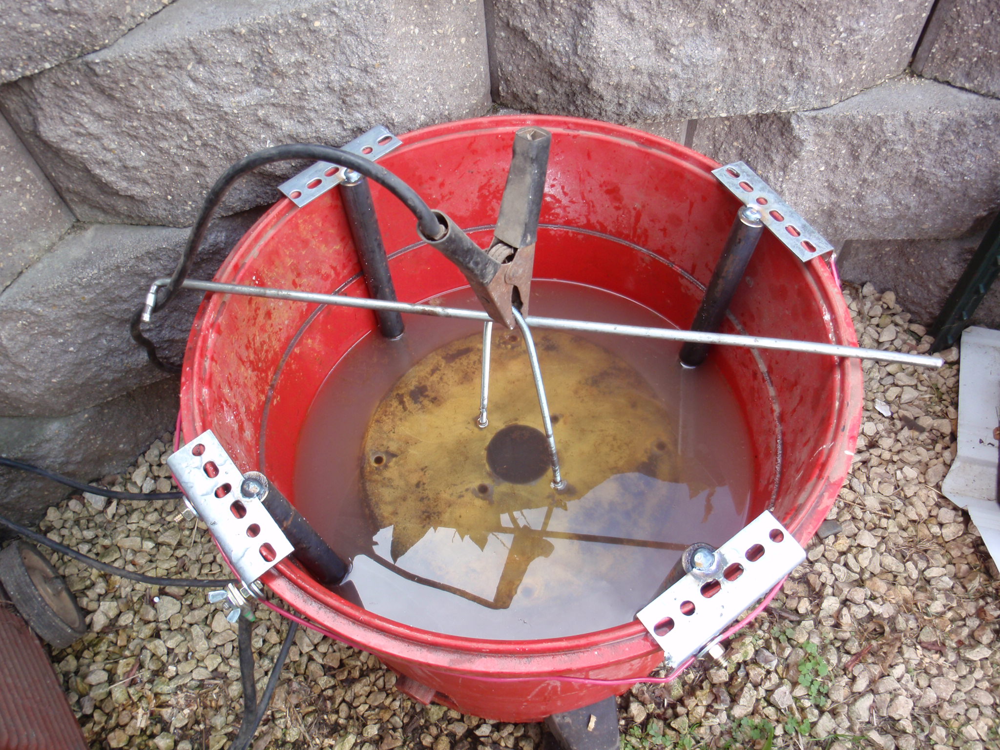 The vast majority of the suspect rust is on the inside of the bucket. Can I literally use the bucket as its own vat? I was thinking I could remove the bucket from the machine and place it on a wood pallet. I would prop it up stable so it will hold the water and washing soda solution using wooden cribbing. Then I can use a few pieces of 2x4 over the bucket to suspend the rebar dangling inside the bucket. Positive lead from the battery charger on the rebar, negative on the bucket.