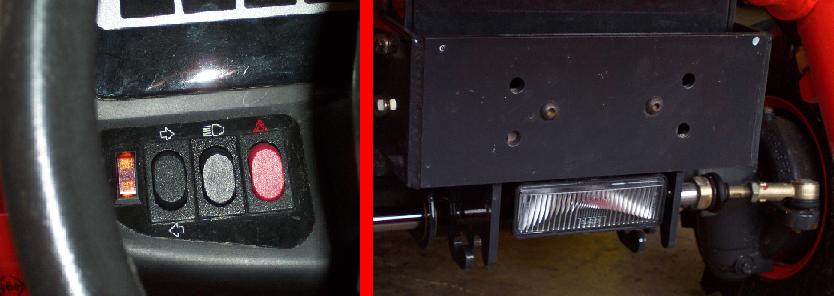 Having this light down low enables me to see not only in front of the bucket with it raised more than 6 inches, but also right behind the bucket if I am using to scoop and I can see if I get too deep and getting into the turf. For power I just piggy backed off of the input side of the switch for the front lights. Then cut a hole next to the switch for the turn signals and placed a rocker switch there.