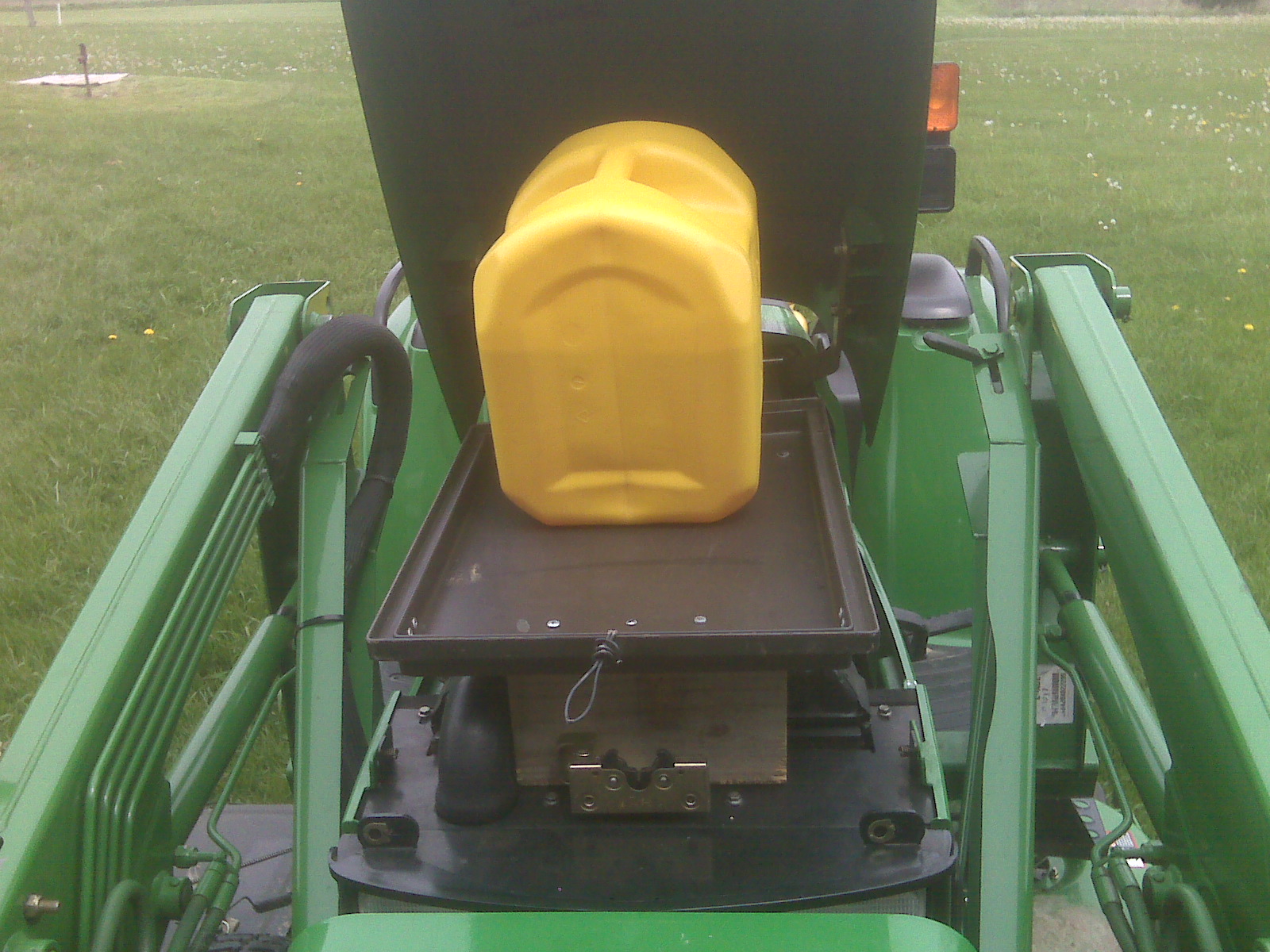 I'm currently using 5 gallon cans. But I've tired of having to climb up on the operator platform to fill my tank and also the spillage onto the hood that sometime results. I started this thread to find a better way.