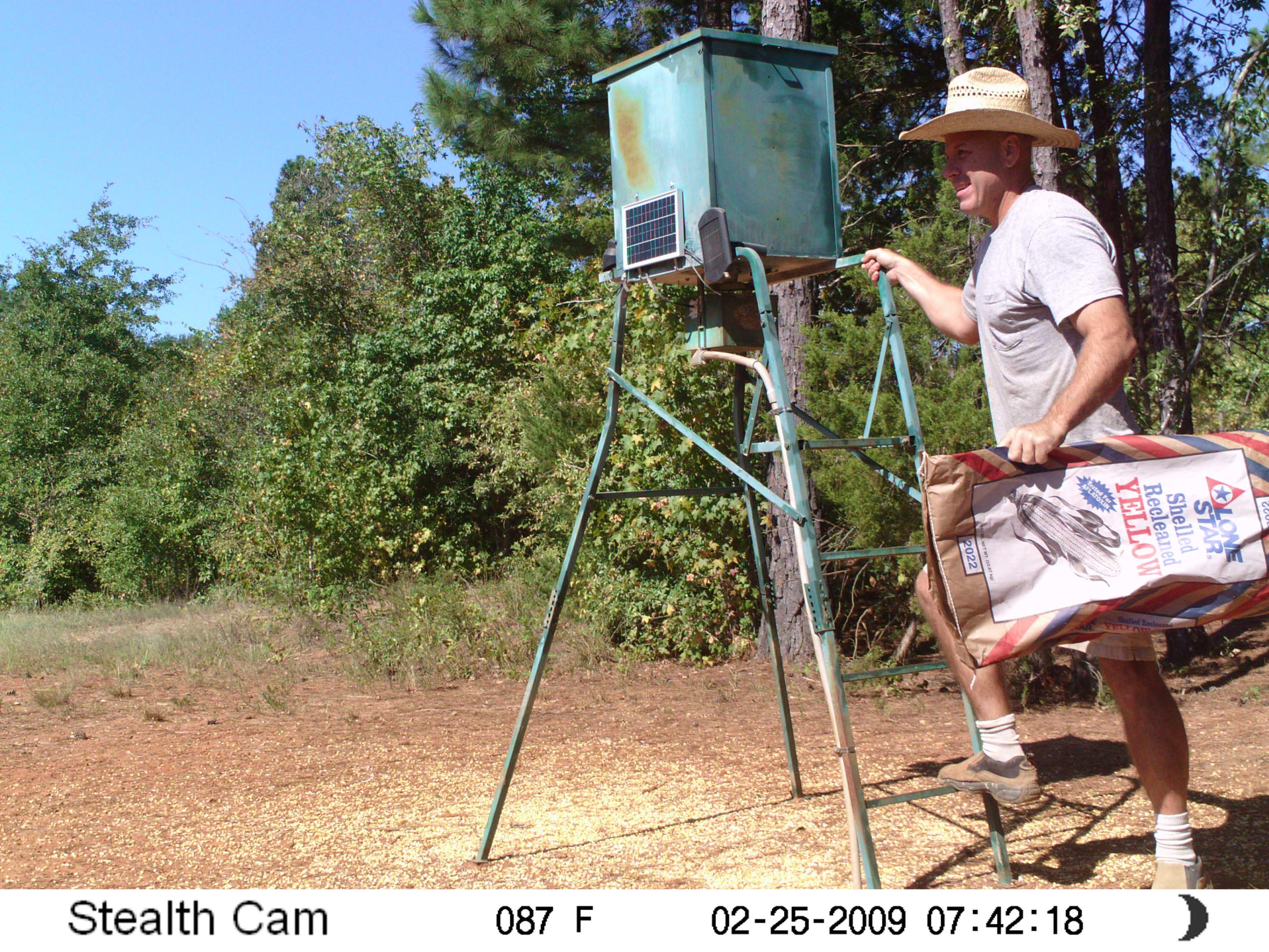Another factor is my camera is being able to use an external 12 volt battery. I have a 12 volt rechargable battery in my feeder. I have a 12 volt solar cell that I bought from Northern Tool on the side of my feeder. This is about a foot square and not our cheapy solar cell that they sell at the sporting goods store. Those didn't last very long at all. My game camera is also plugged into that same battery.