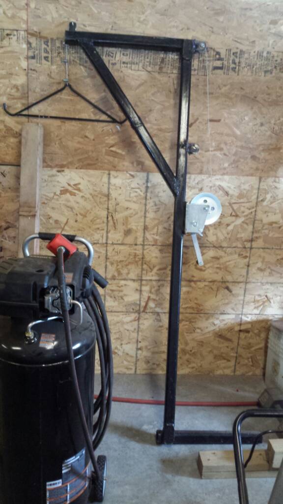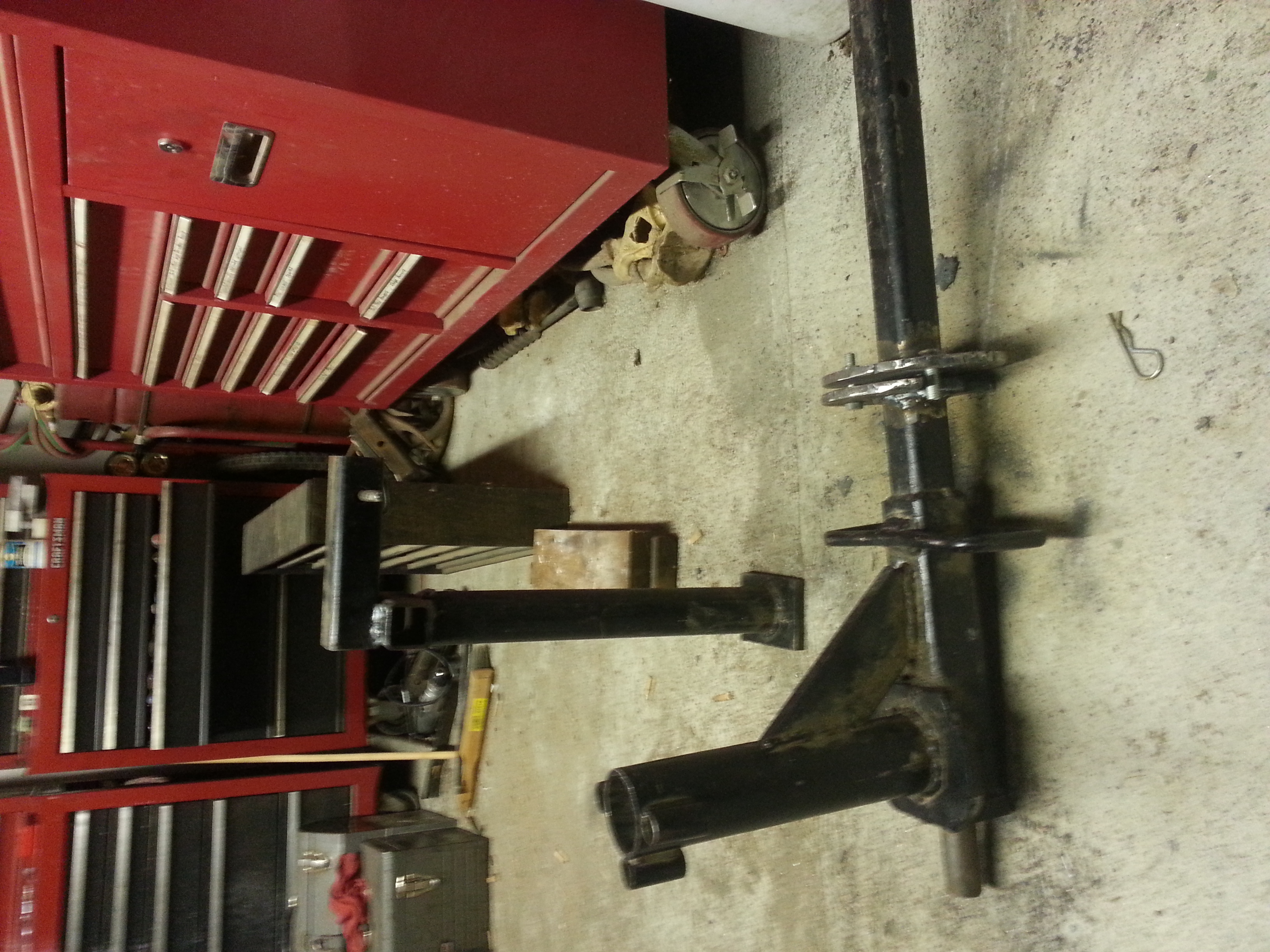 Yesterday , We decided to modify that hoist to make it easier to assemble . Lifting that top section up to drop it into the winch tube was a BI*** , with 3 of Us . Thus We ended up and cut the reciever extentsion , added a piece of 1 3/8" solid rod through out the entire length . Were We cut the extension tube , We welded a 7" x 1/2" round plate to the 1st section and also welded the solid rod to it . On the other piece of the extension , We welded another similar round plate , but did not weld the solid rod to that plate . 1 3/8" holes had been already drilled by My brother in the round plates , thus the rod is solid all the way through . In those round plates , the first has 2 holes , the second has 1 and the 2nd is also notched for 1/3 of the distance . Hard to explain , but the assembly , when installed in my hitch , will now rotate from vertical to a little past horizontal , thus eliminates having to " Lift " anything more than waist high . The 1st plate has those 2 holes , 1 hole for a pin to hold the hoist in a vertical position , the 2nd hole had a pin welded in place to act as a Stop , thus the reason for notching in the 2nd plate . When we lift it to vertical , it will not be able to go completly over the other side , as the second plate hits the stop .
