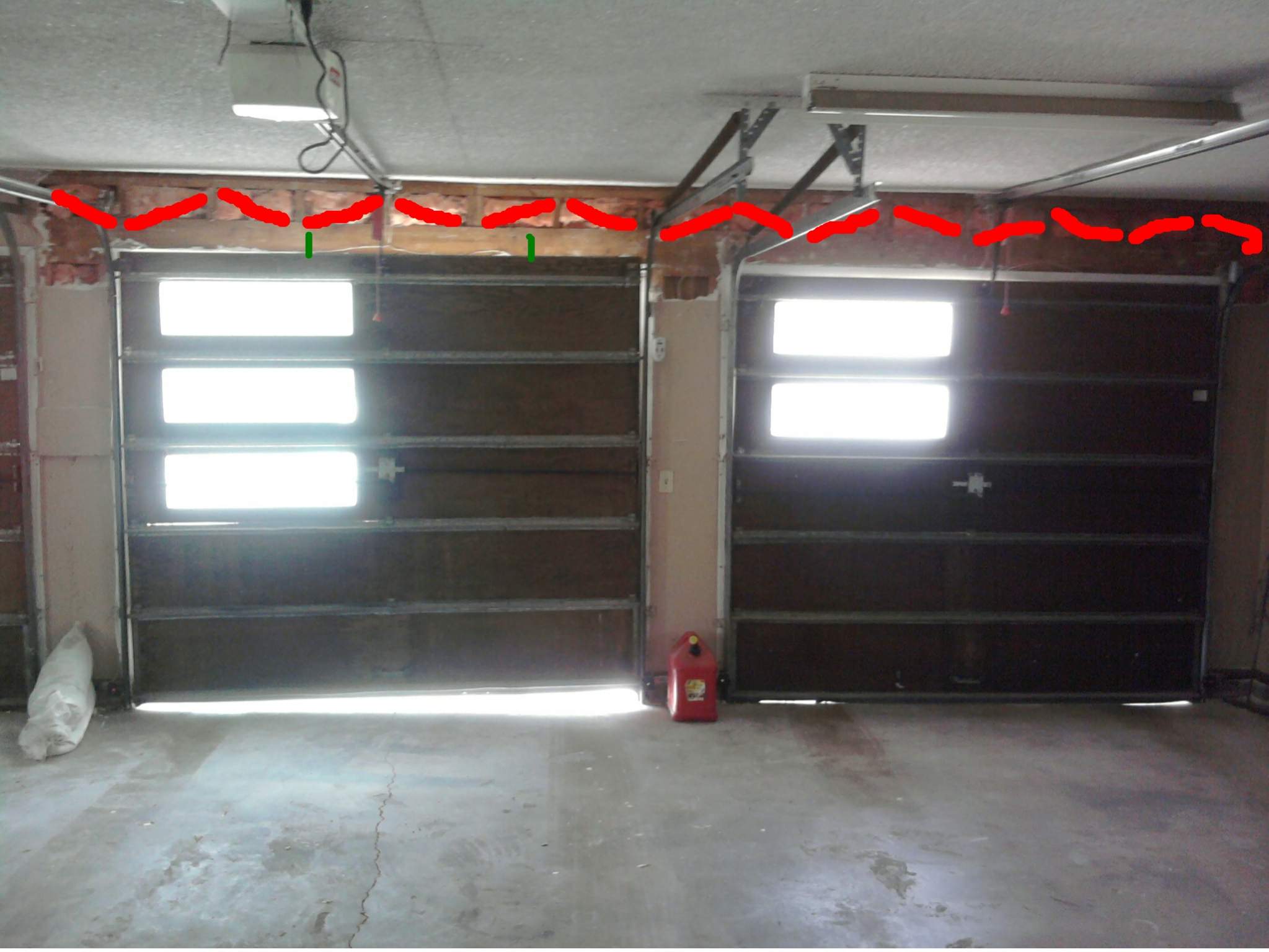 here i've removed the doors and replaced the header. i believe i used a pair of 1 3/4x 11 3/4 lvls glued and nailed together, but it's been a while, so they might be deeper, but i really don't think so.