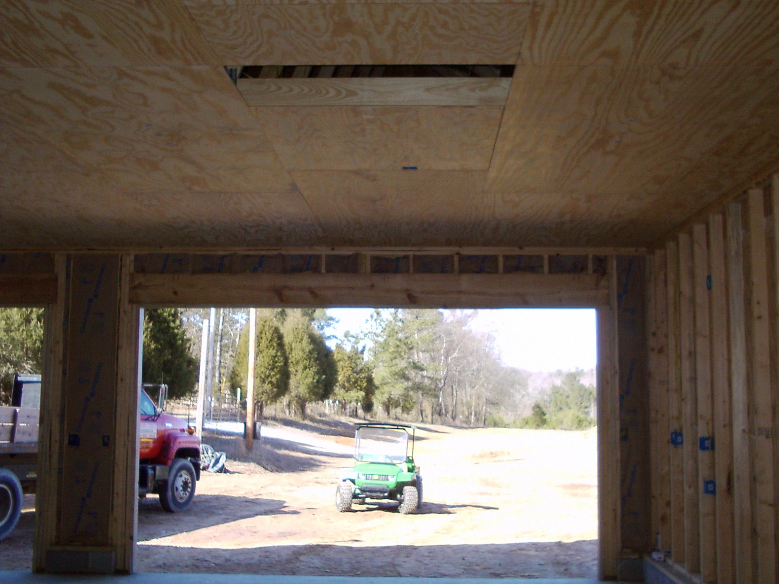 as you can see, the gable end has virtually no load on it. i did not have a continuous header, but in stead two separate headers supported by the studs between the doors. you can see that the whole front of the building is just hanging even without the center post supporting it. the plywood sheathing is what does the work here. it braces and supports the front wall. the 2x6 nailed across the front is just to keep things loosely tied together so that a freak wind storm wouldn't rip the unsupported doors apart. to dispel any questions of sagging and load on the gable end: after jacking the building, i ran a string across the front of the building. there was only 1/4" of sag at the center of the wall BEFORE i tied them together with the continuous 2x6, and that's with everything just hanging, and absolutely no header.