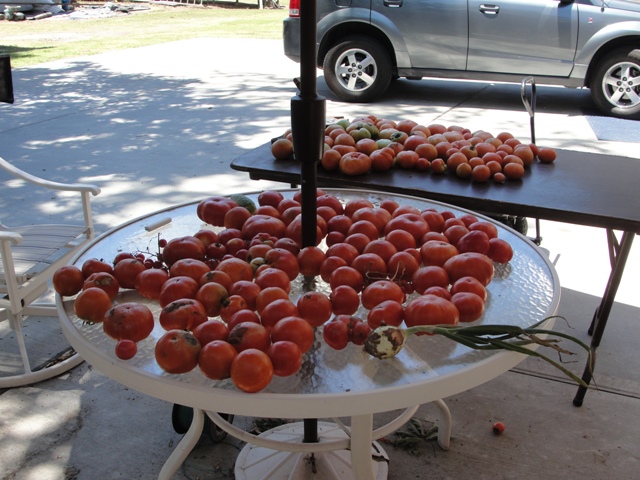 Here is a picture of tomatoes. The first table is ready to can, the second will be in a day or two.