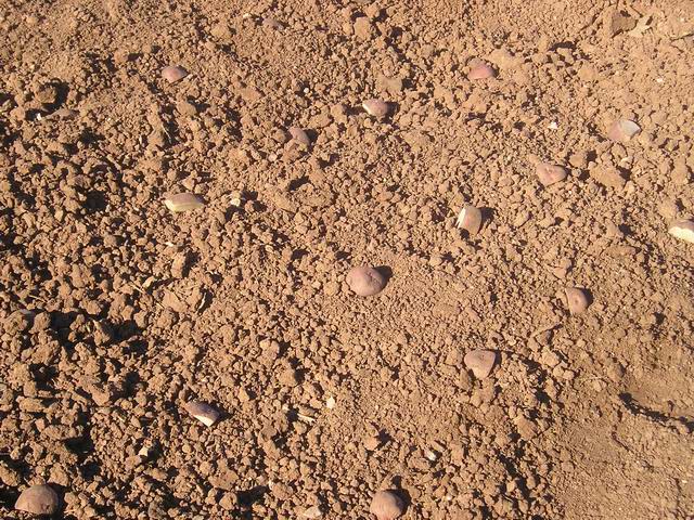 The potatoes are spaced in a 10" to 12" matrix on a 10' x 20' plot (about 10# of potatoes). Oh yes...we did press the seed potatoes into the surface of the ground instead of just leaving them sitting on top.