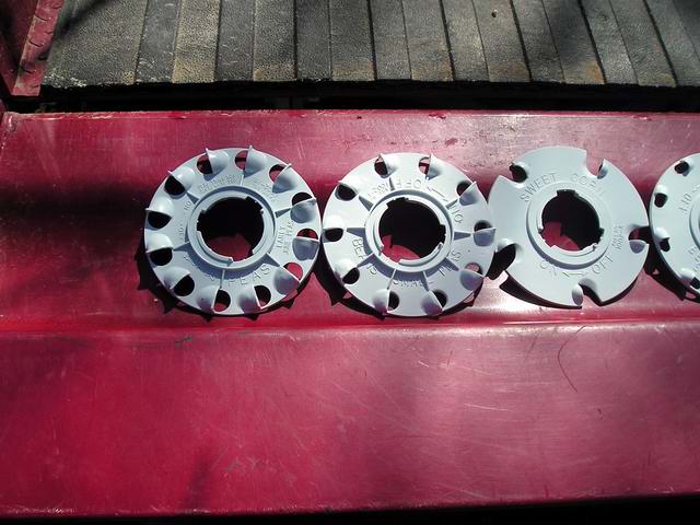 Bird, the Wolf Garten planter comes with three seed wheels. Two wheels are stored on the back side while one is in use. If it works good for larger seed, I'll post some pictures. It's so simple and lightweight that I hope it works as well as I want it to work.