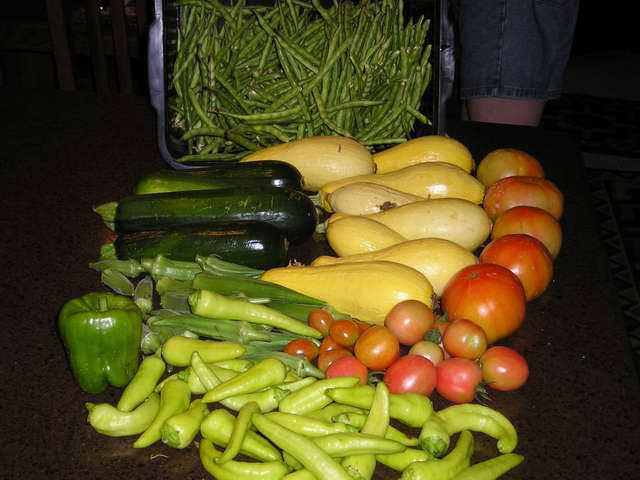 It's 9-1/2 weeks and the harvest is starting to come on strong. Of course, I planted too much squash, but so far we've easily found people to take the excess off our hands. Heres a "cornucopia" of tonight's harvest.