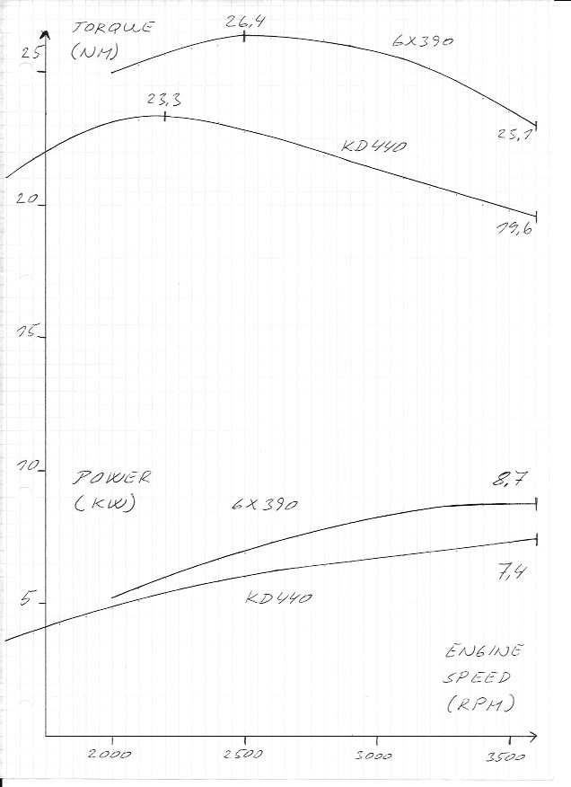 Although in this comparison the gasoline engine is the most powerful one with 11.7 hp compared to 10.1 hp for the diesel engine, the more elastic characteristic of the diesel engine (94.5% compared to 64.6%) might give the impression that it is more powerful when using it in real life in a tractor, as it copes better with an increased load; especially if the engines are not run at wide open throttle and at rated speed. In reality, the KD440 having "only" 10.1 hp, is of course less powerful than the GX390 having 11.7 hp, but its much higher elasticity makes it more suited for work in the medium to low-speed range and at part-load, where it will probably spend most of its time.