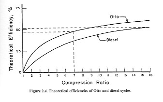 As seen on the figure below, the Diesel-cycle has a lower theoretical thermal efficiency than the Otto-cycle, if they have the same compression ratio! In the real world though, the diesel engine has a much higher compression ration - as seen above, and therefore a higher theoretical thermal efficiency than the gasoline one, leading to a lower fuel consumption. [Goering & Hansen, 2008]