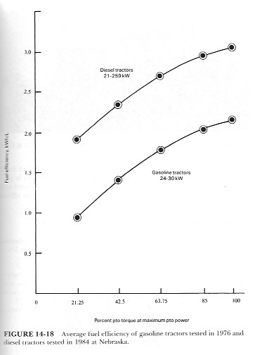 Note that the unit for fuel efficiency in the figure above is the inverse of the one used for the GX390 and KD440 in my examples above! At 100% load, the average gasoline tractor produced around 2.1 kWh/L in 1976, and the diesel tractors tested in 1984 around 3.0 kWh/L - or (3.0-2.1)/2.1x100 = 42.9% more for the same amount of fuel. At 21.25% load, the numbers are around 0.9 kWh/L for the gasoline tractors and 1.9 kWh/L for the diesel tractors. Now the diesel engine produces (1.9-0.9)/0.9x100 = 111.1% more - or more than twice the amount of work for the same amount of fuel!!! In other words, the diesel engine consumes 0.9/1.9 = 0.47 - or less than 1/2 that of the gasoline one. As expected, both tractor types are less efficient at reduced load - the gasoline ones are just more than twice as bad as the diesel. The same trend can be expected for the Honda and Kohler engines.