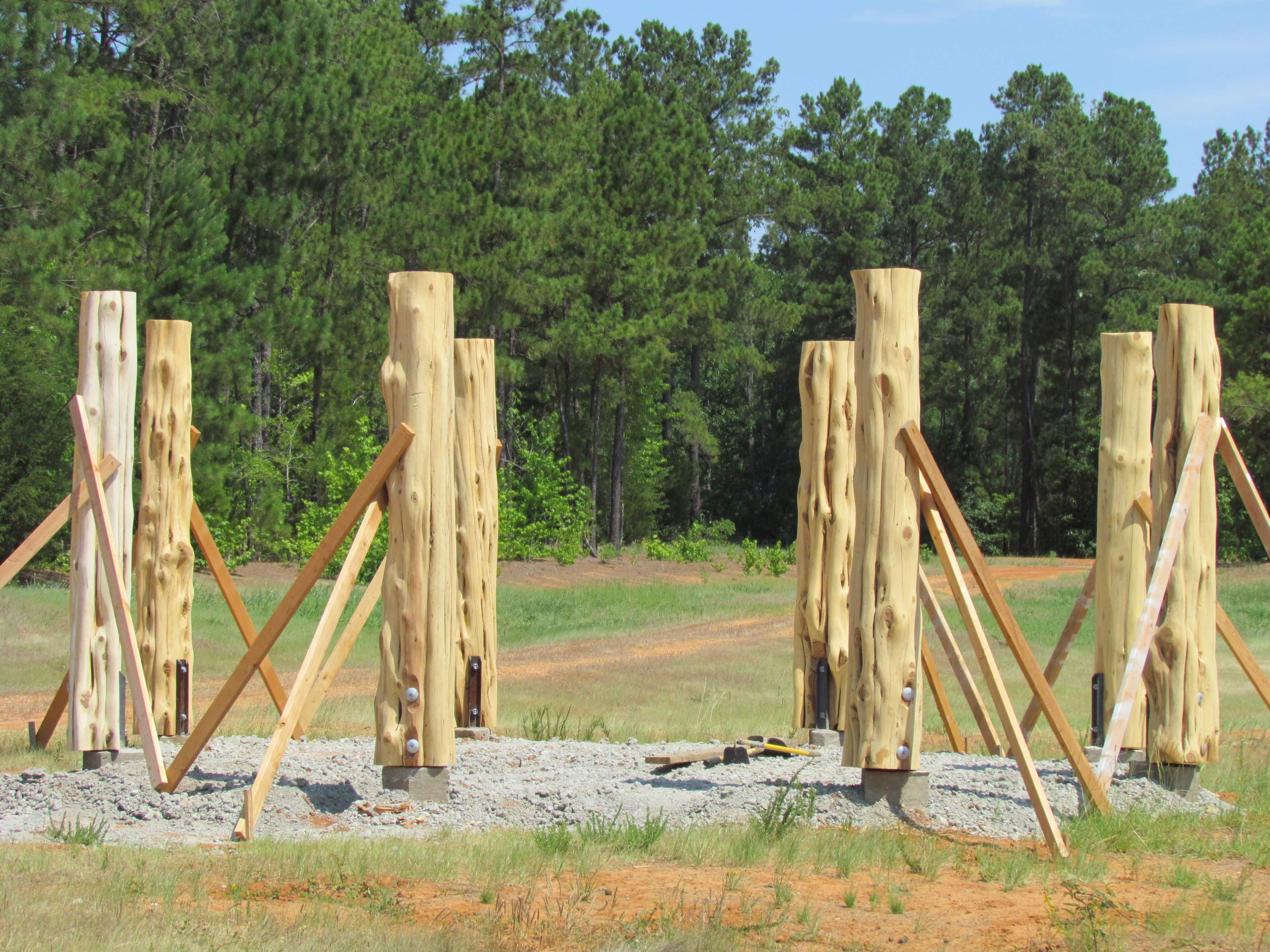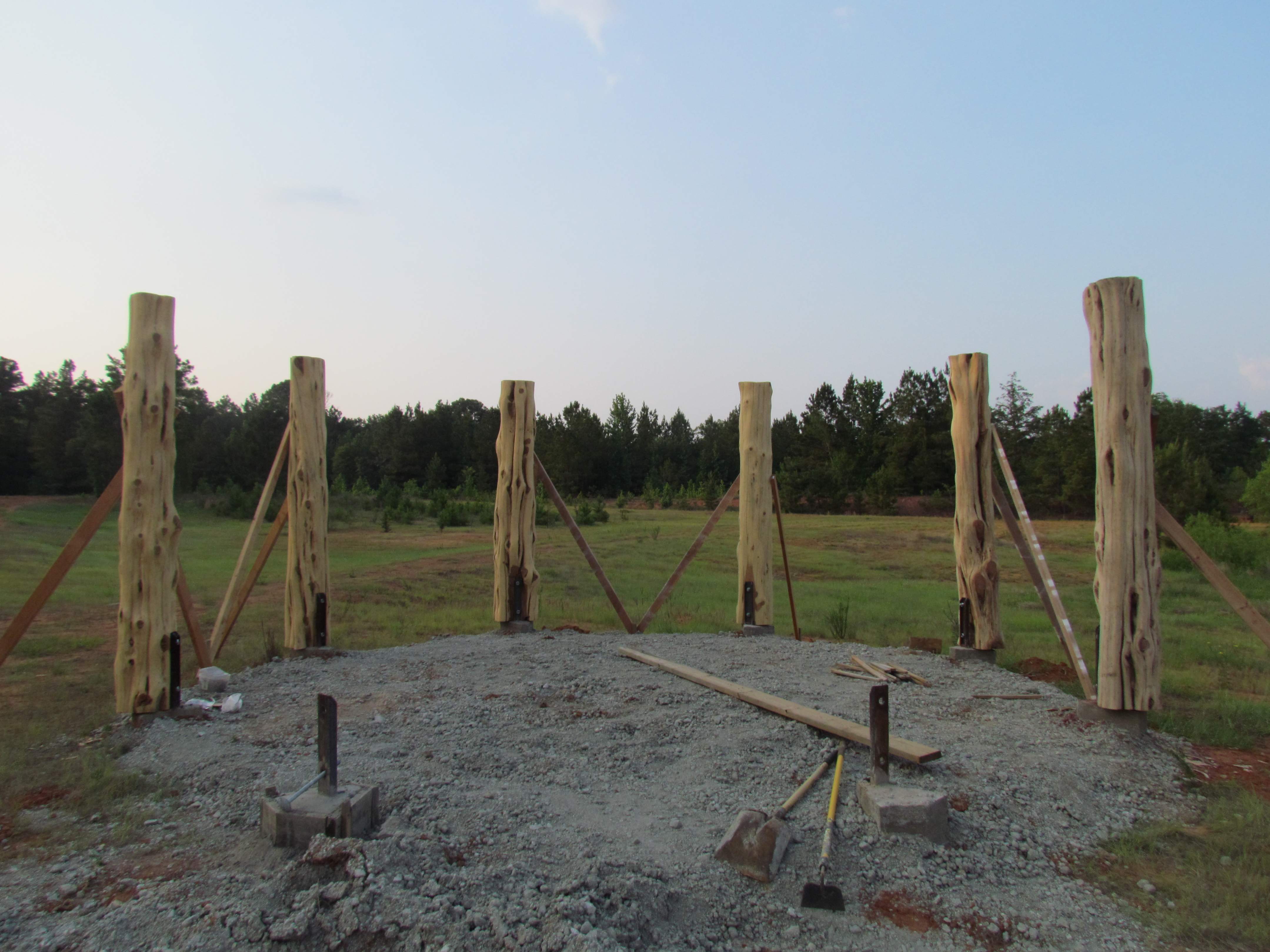 I will find six or eight straight logs, currently cut to 16', that are a similar diameter. I think I will leave the bark on. My thought for the bases was 8" sono tubes with 1" pipe at the center. Then I would bore a 1 1/8" hole in each post and drop on the pipe.