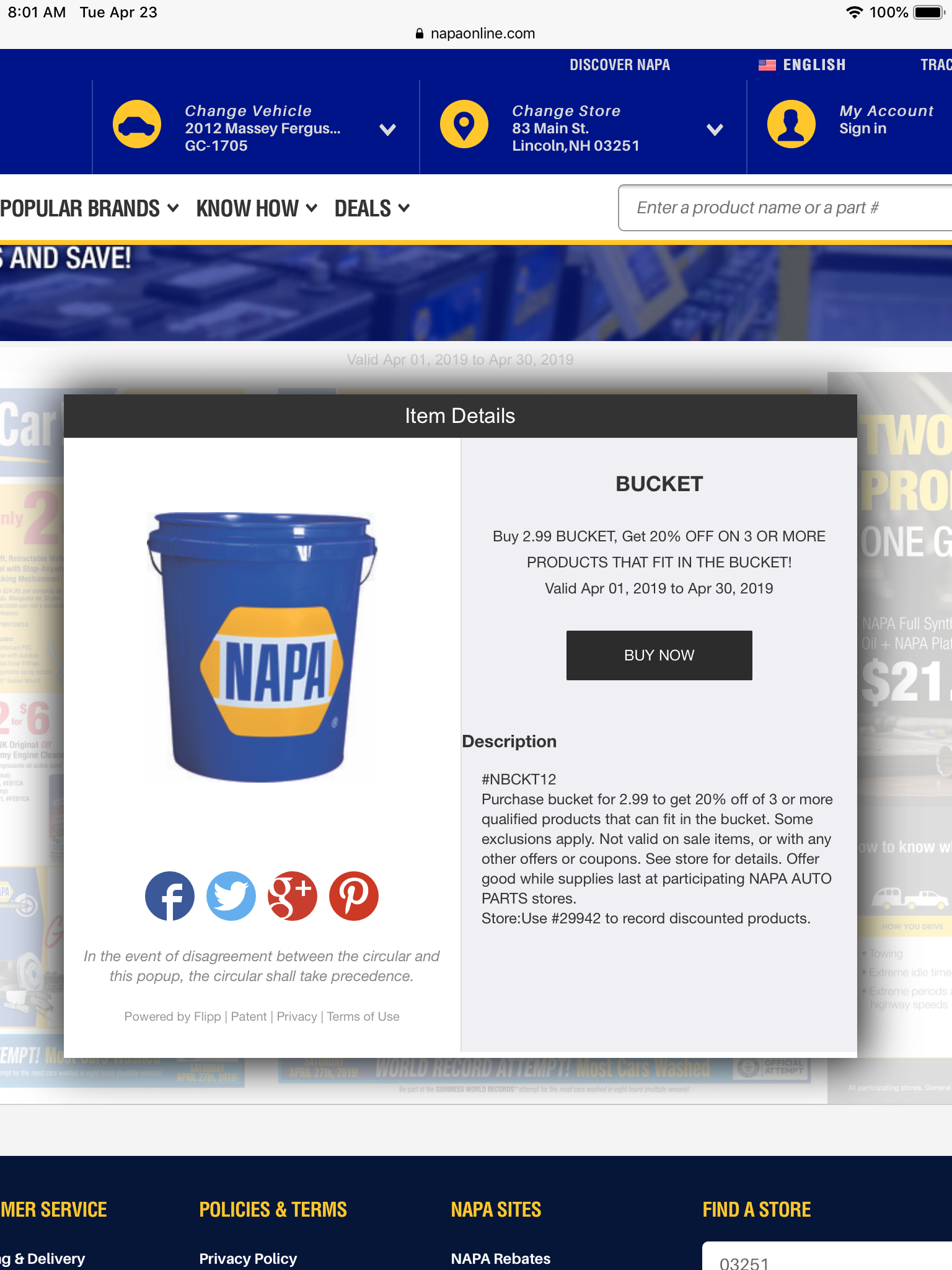 I have relooked at the card (postcard size) from my local Napa Store that says the filter sale is from today, 4/22, until 4/27, and I don't know anything about buying a bucket.