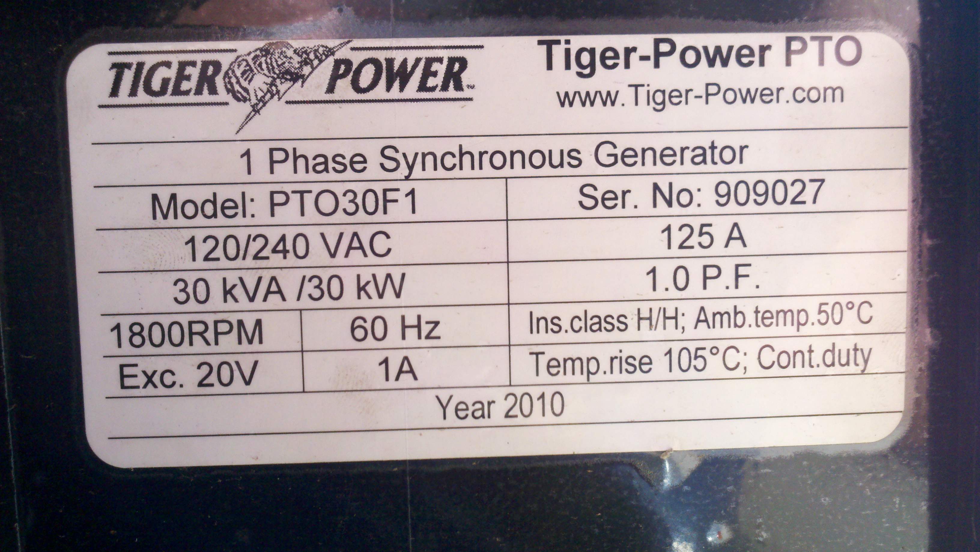The Tiger Power generator is listed as power factor 1.0. So it would be 30,000watts=30kw=30kva with a ample 90kva surge rating