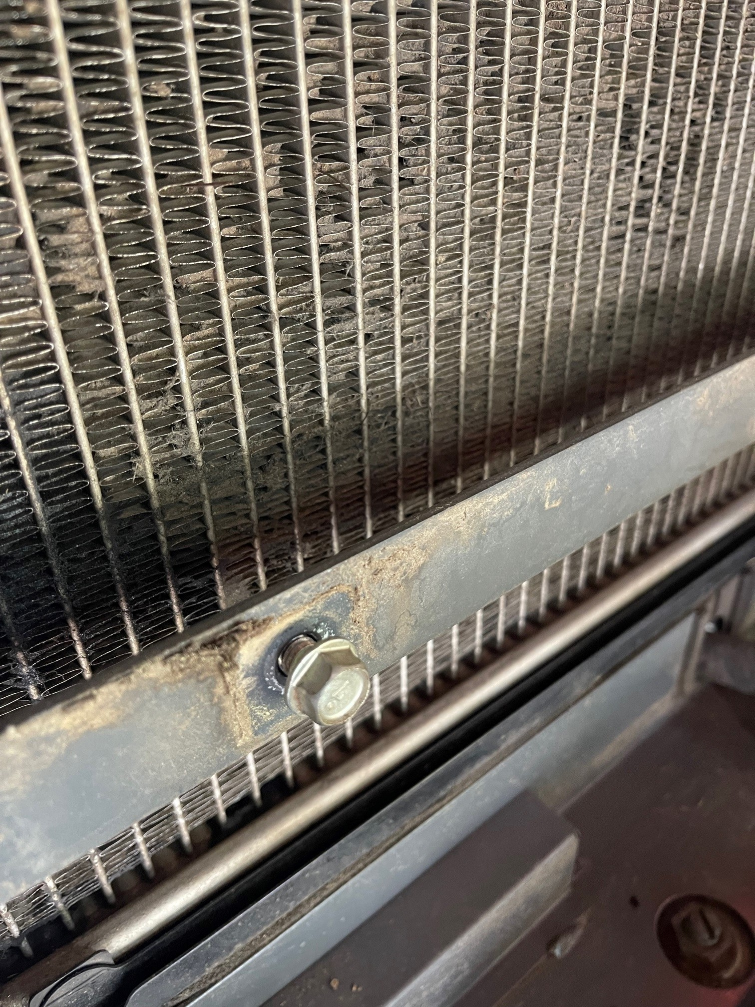 This past weekend I decided to try to figure out the issue. I found it and I was a bit shocked. Normally I wash the tractor after every job, and when I do, I clean the radiator with the hose. I blow it out from back to front using water. But I looked carefully, I noticed the fins were blocked. Dirt and dust packed into the radiator, but deep enough that at first glance, it looked clean. It was not!