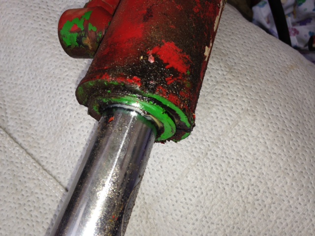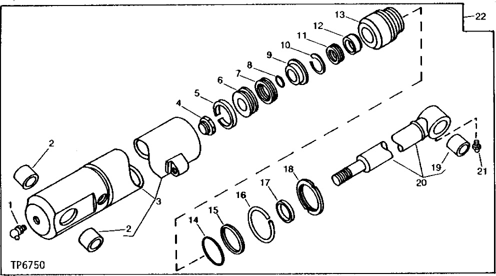 You may have to clean the paint off the threads on the nut, to get the nut off. If the whole end keeps turning you may have to put it back in the loader and pressurize the rod end of the cylinder to keep it from turning to get the nut off. Number 16 is the snap ring that holds it together. Remove the nut #18, drive in #13, do not damage the threads for the nut. Remove the snap ring in side the barrel and then it will come apart. #13 is held from coming out by the snap ring and the nut keeps #13 from moving into the barrel.You have to unscrew the nut on the end with the notches. Then drive the end of the cylinder in to remove a snap ring. Then it will come apart. Watch the video.