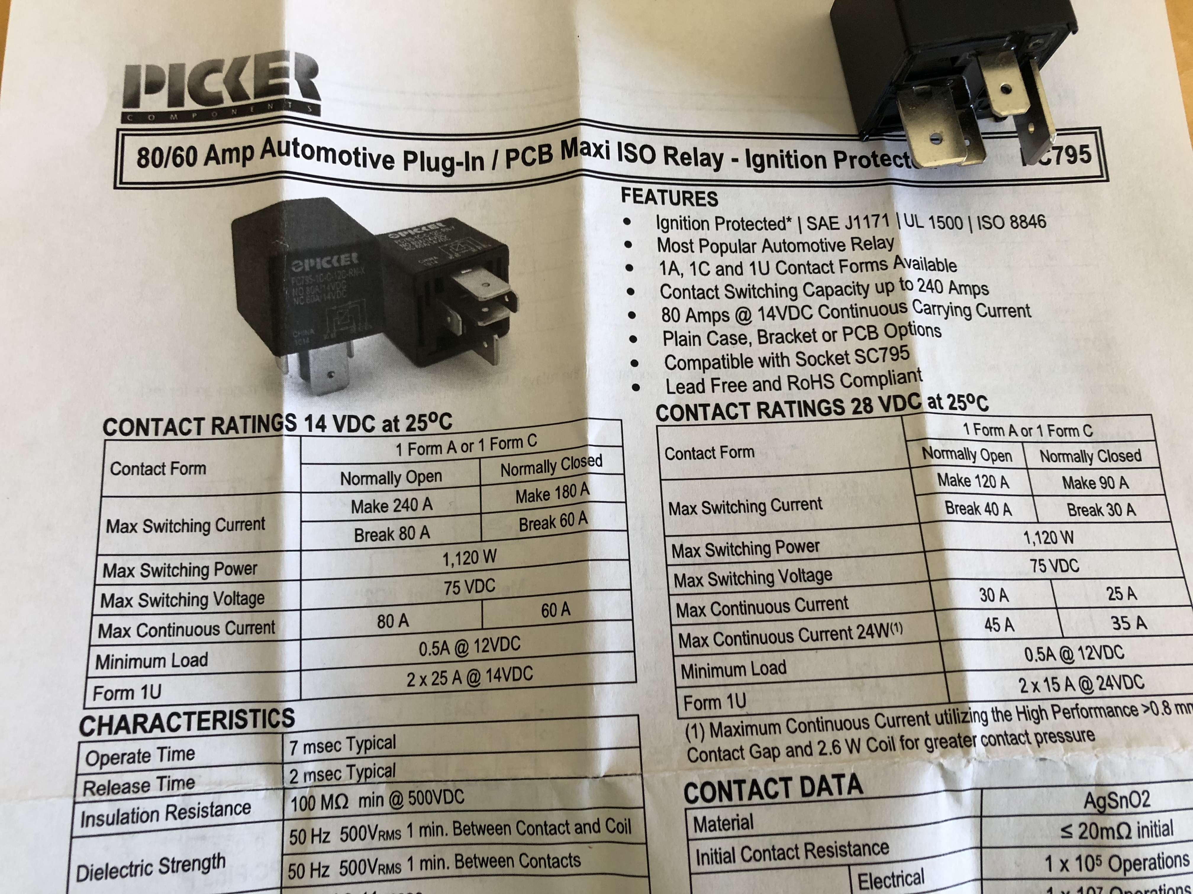 Two new 80 amp relays with the larger 3/8" tabs for the power side of the relay arrived today. 80 amps is overkill, but that is what I bought off amazon. Picker PC795-1A-C-12S-RN-X at $18.99 for the pair. They are sealed units, with nickel plated tabs and a resistor to protect the voltage spike that occurs when the field collapses.