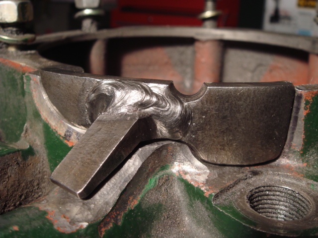 I know cast iron welding is always a good topic, but thought I would offer a brazing example. Purchased a nice little Goldoni Base 20 (John Deere 20A) with 208 hours. The owner had water in the rear differential that froze solid (locking his left rear wheel) and he tried to free it up by repeatedly dumping the clutch in low range first gear. Well, apparently it worked, dragging the ice right up inside the final drive bull gear, hitting the drive and exploding through the case and axle tower. Bad for him, good for me since it took about $4000 off the value of the machine. The bull gear, axle and diff drive unit which were damaged were $1000. A new case would be another $1000, so I decided to braze it back together. Note the axle spline twist, that little Lombardini diesel has some torque. The hole in the case is where a section of the bull gear pushed through. The drive stub is the result.