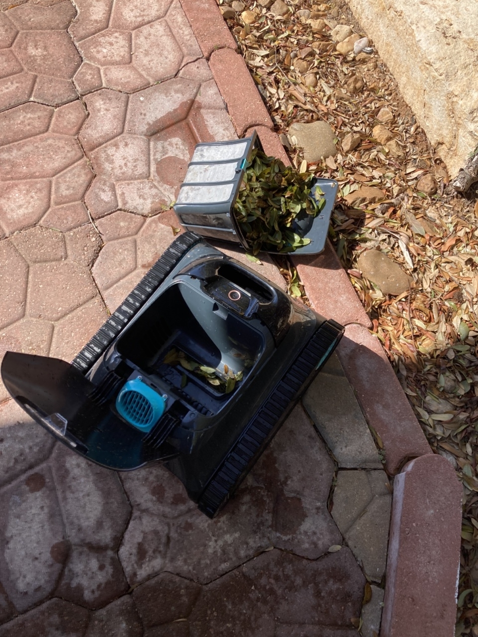 Good Morning! 48˚F heading to 70, N wind, sunny skies. Had 1/4" rain yesterday morning. The NW wind was very strong yesterday sending hundreds of leaves into the pool. The two surface bots were blown to one end of the pool and were stuck. Pool floor bot was overwhelmed as you can tell from the pic below. He was emptied 4 times and has a lot of work to do today also, At the gardens a large tree was blown over and many garden's equipment was blown four gardens down.