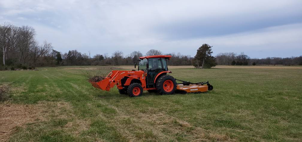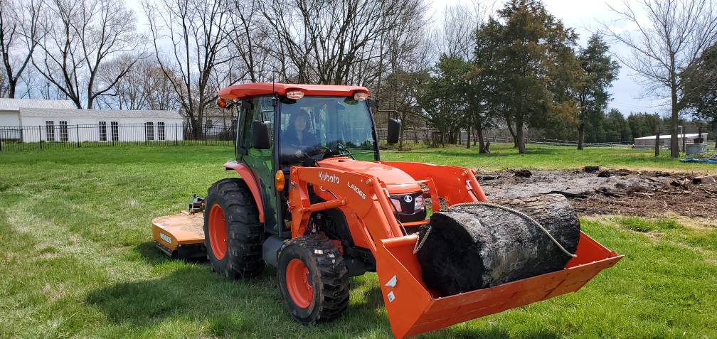 I dropped the loader and plane, put the deck on and mowed the grass today. The attachments are so easy to take off and put on, it’s amazing. And no, I’m not stuck between trees! LOL But you can see the ugly patches that are just starting to green in. The tractor is so maneuverable that it took the same basic time as my Kubota zero turn, and the cut was terrific.