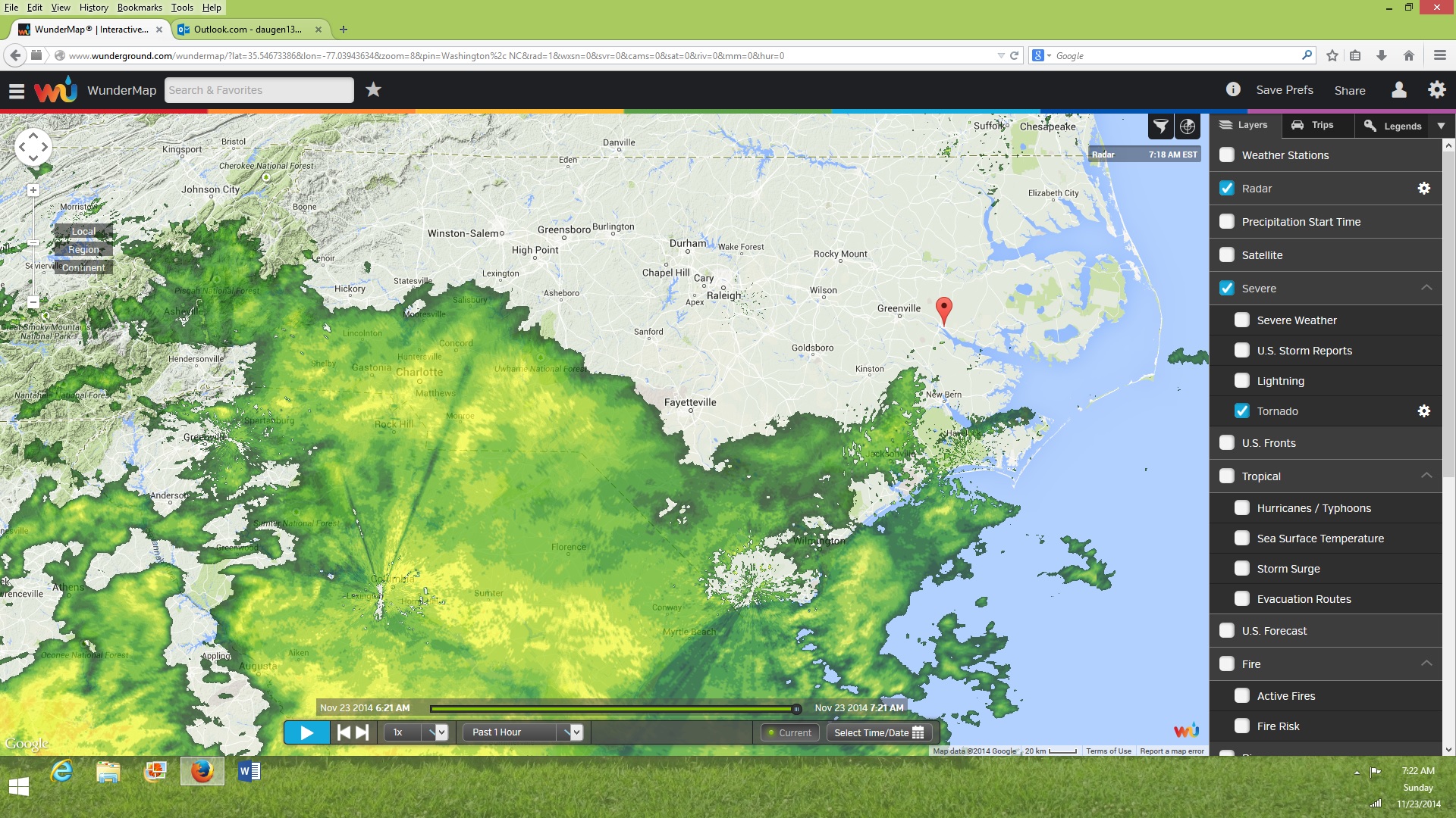57 this morning and headed to 58 today. Maybe I'm late on the forecast I did sleep in. Chance of rain 100%. Although radar doesn't look to promising. High wind advisory out. Gusts by tomorrow morning above 45mph. Cold front due through early in the morning.