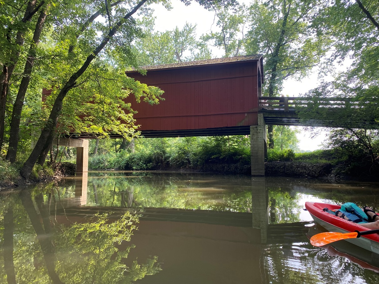 We got up Sunday morning and took it on it's maiden voyage to Lake Springfield, where we finally made it far enough up Sugar Creek to get to the famed covered bridge. We strapped the kayaks together floating around under the bridge and ate a PBJ and some snacks. There were a few places close to the bridge that were challenging to find ways through the debris in the creek, but we managed without having to get out and portage around any of it. It was about a 7-1/2 mile round trip paddle, and I am feeling that today. Good time, though. We stopped on the way home at the same Mexican restaurant as last weekend, and the food was still delicious.