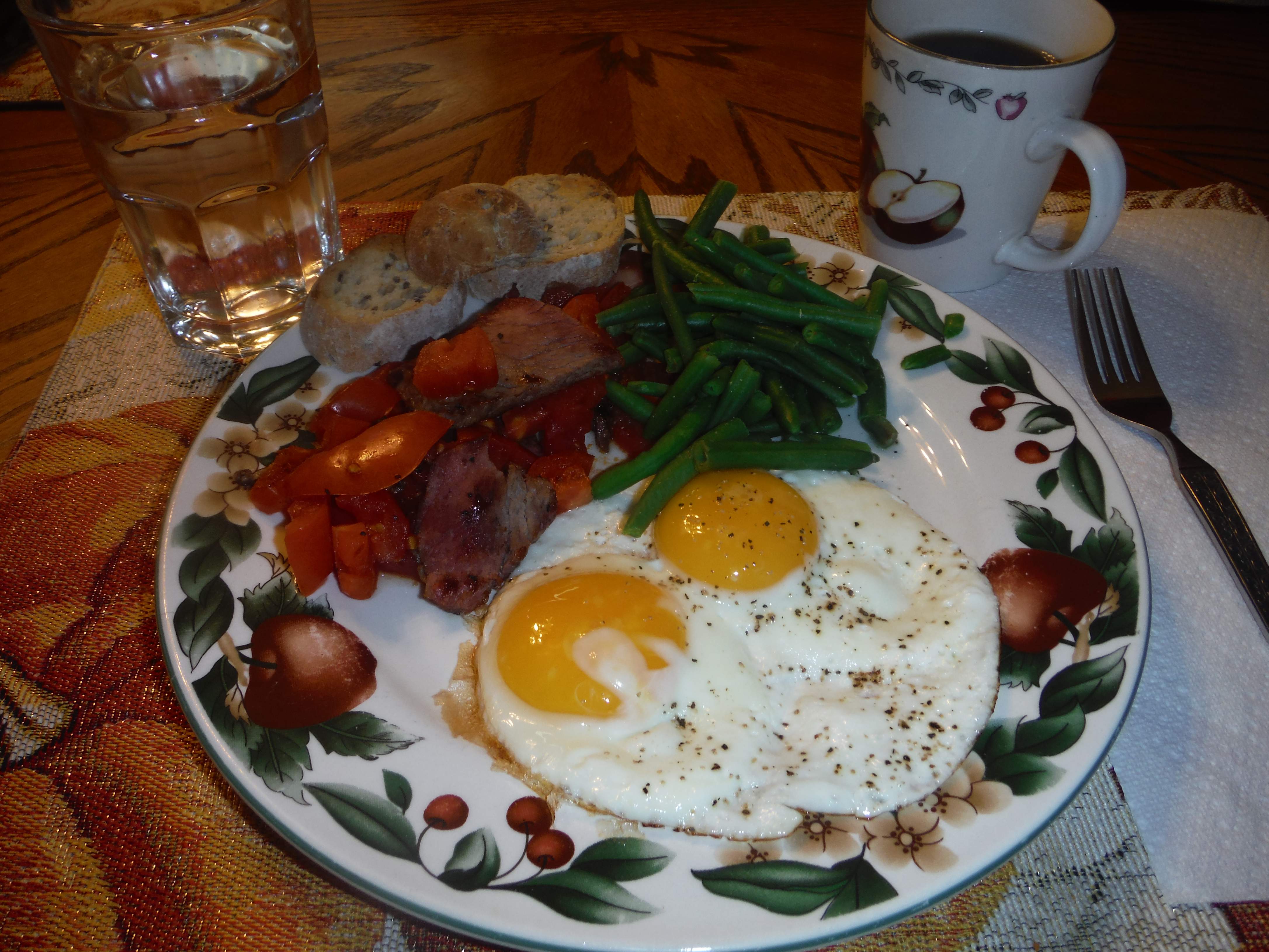 Here is my breakfast. Sirloin tip and tomatoes, eggs, green beans and toasted baguette. {Maybe I need to start a new thread}