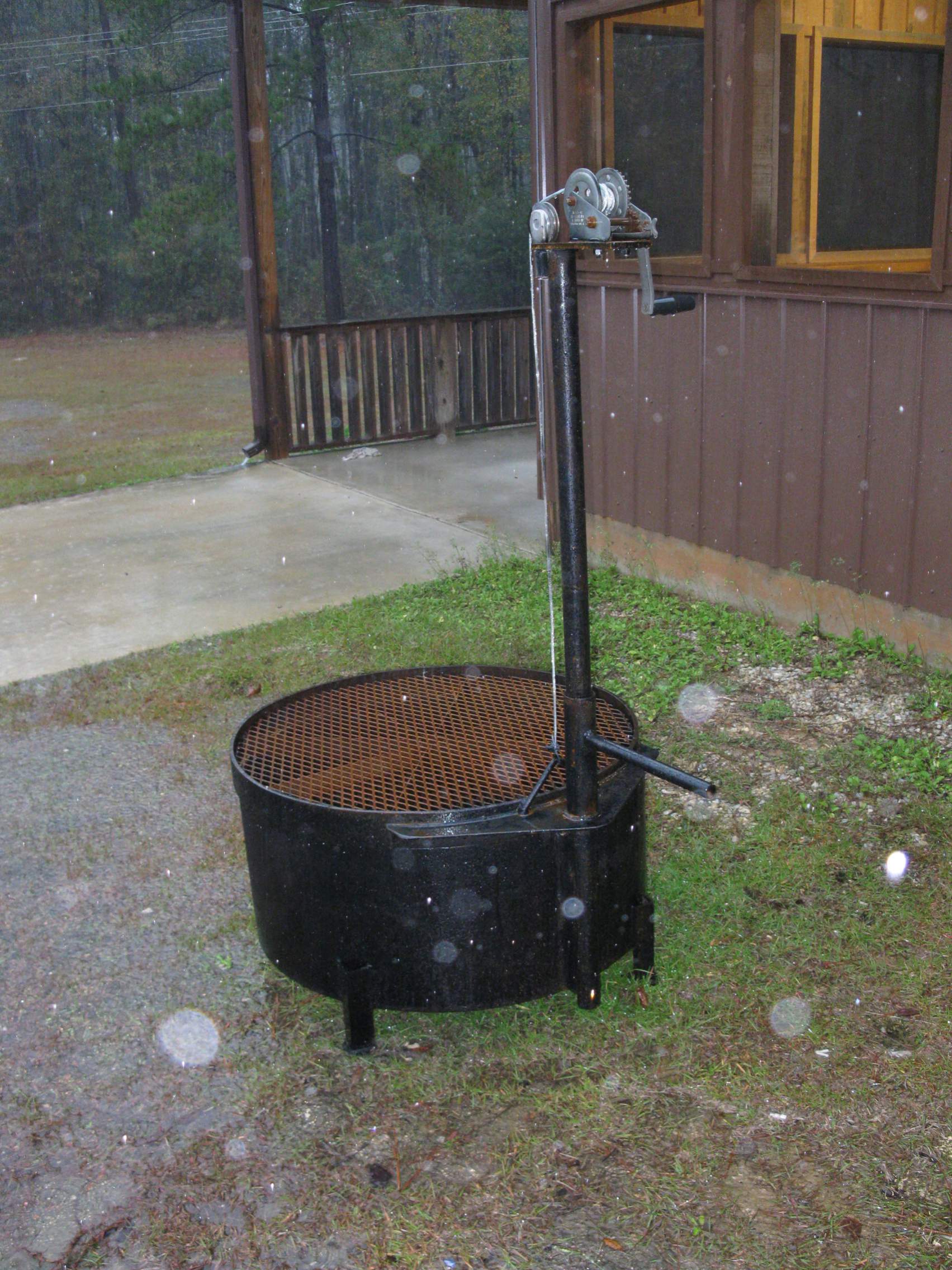 Hey guys, I know how much you all like build projects, so I'll show you a couple we have recently completed here at the Civic Center. My boss's husband is a metal worker, and we got him to knock this grill together for us. The area it is going to go has to have some dirt brought in and leveled then we are going to put down pavers and a couple of benches. It should be nice when we get it finished. And there are a couple of views from the inside of the cook shed. It's a metal roof and sides with screen and rough cut cypress on the inside. We still need to make some shutters to keep out the blowing rain like we had today, but that will have to wait until the money shakes loose in the budget. We grilled {on a smaller grill} our Christmas party lunch out there and ate it in the cook shed. Lots and lots of rain today, but with good food anything is better.