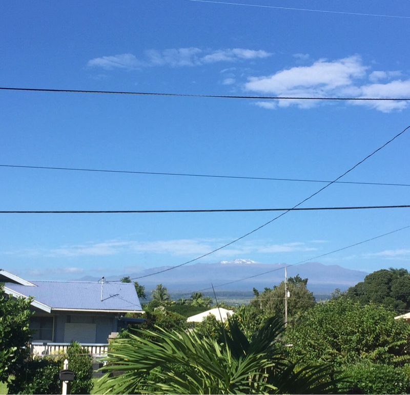 "Look hard, but you can see snow on Mauna Kea from our impromptu trip to town this morning."
