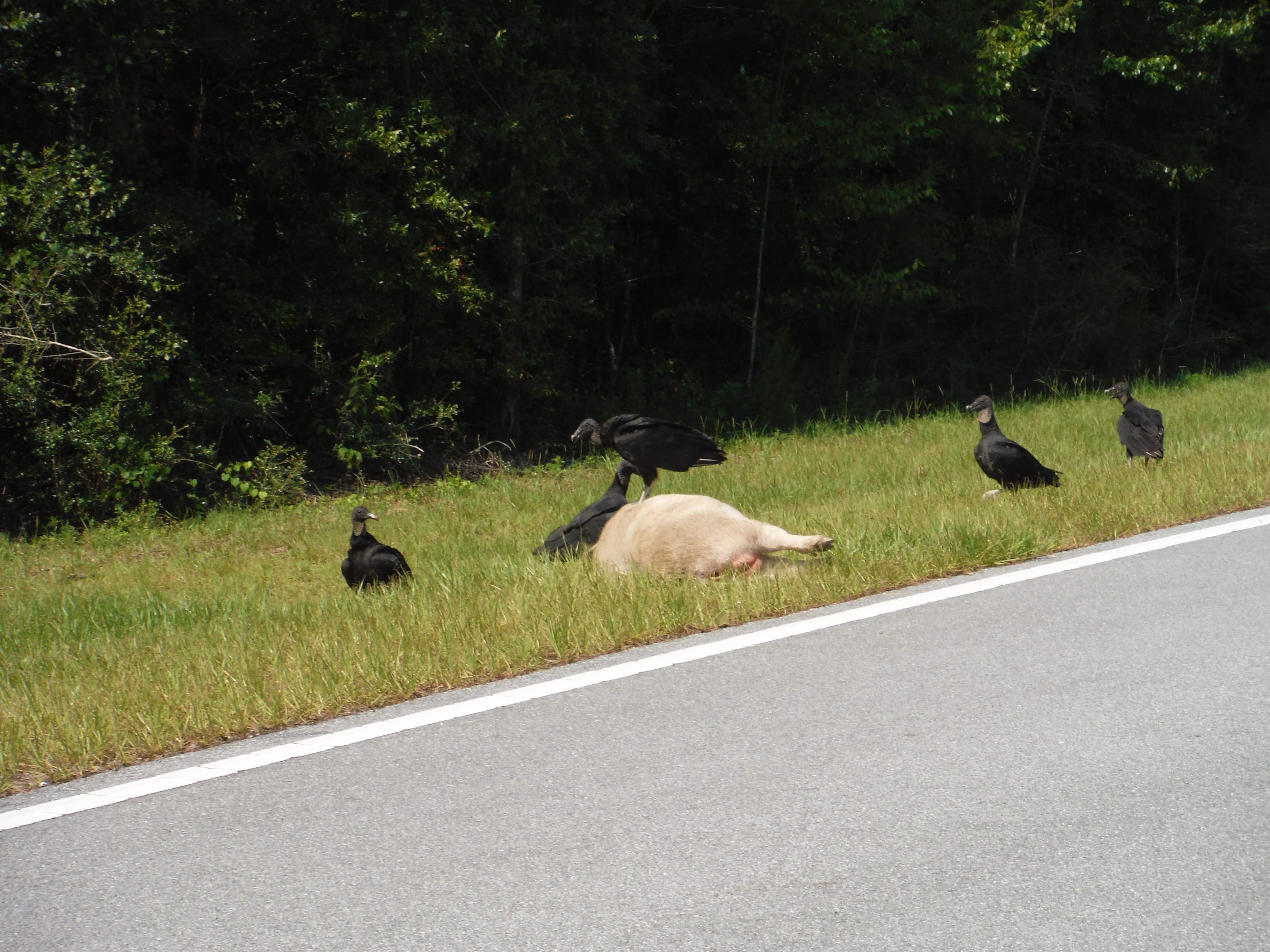 Fox squirrel came running down the road toward me. I stopped and got out my camera. He stopped and checked me out for a couple of minutes before leaving the road. When I got to the turnoff to the pond, I saw buzzards up at the crossroads. Drove on up and found a dead boar hog. All you can eat breakfast buffet? As long as you like pork. Then down at the pond, the African cattle egrets were thick.