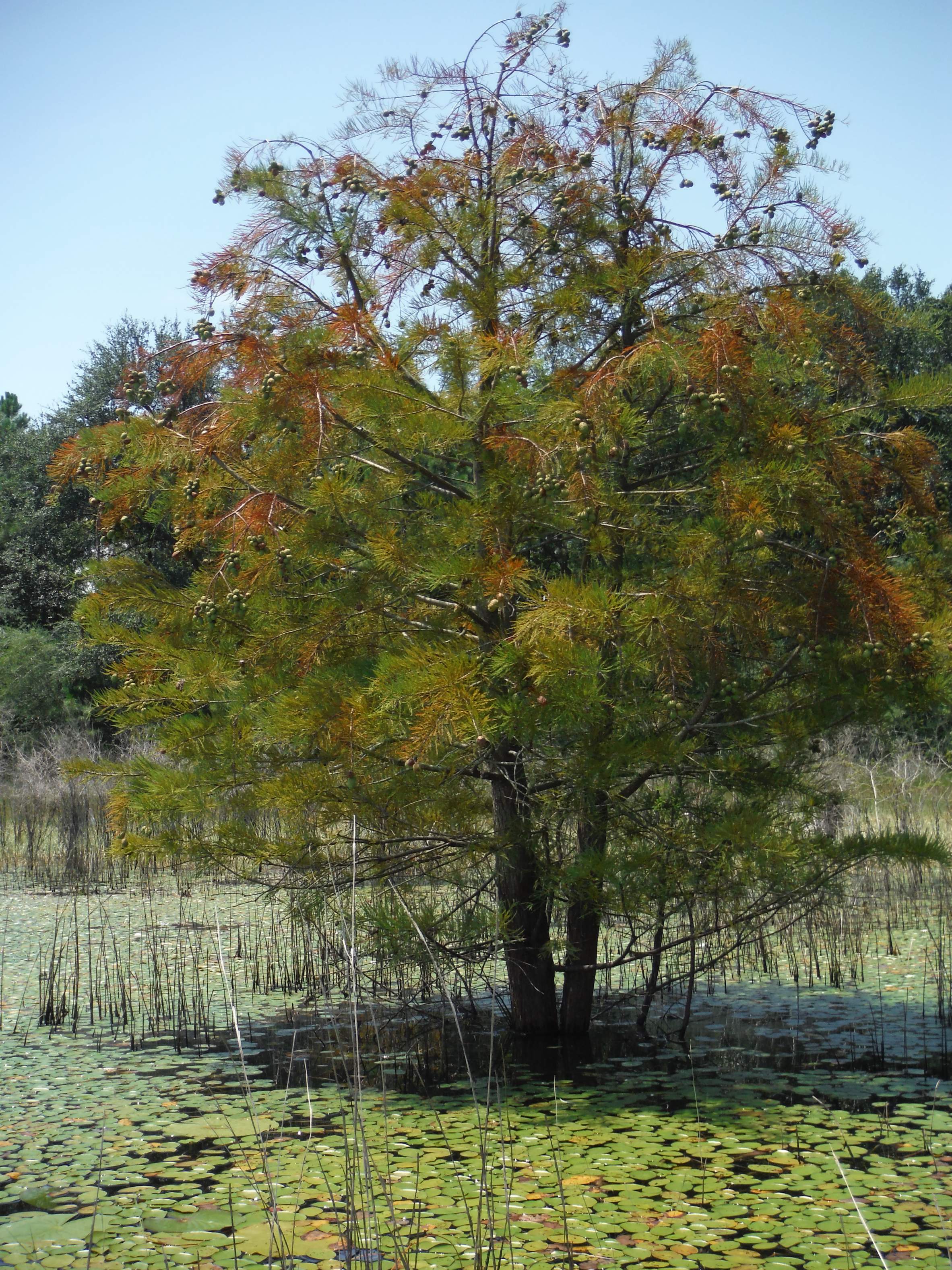 RNG, the lily pads bloom at 1100. Or at least they were today. I was happy to see seed balls on almost all the cypress trees. That means if 15 or 20 years I will have a true cypress pond.