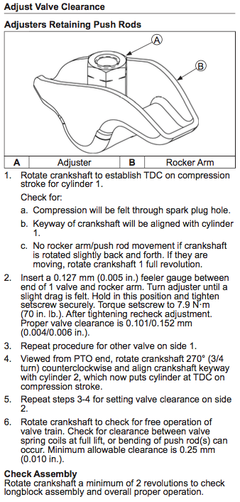 I looked over the procedure for adjusting the valves in the Kohler Service Manual. Seems pretty straightforward, outside of ensuring you're at TDC on No. 1 before you start: