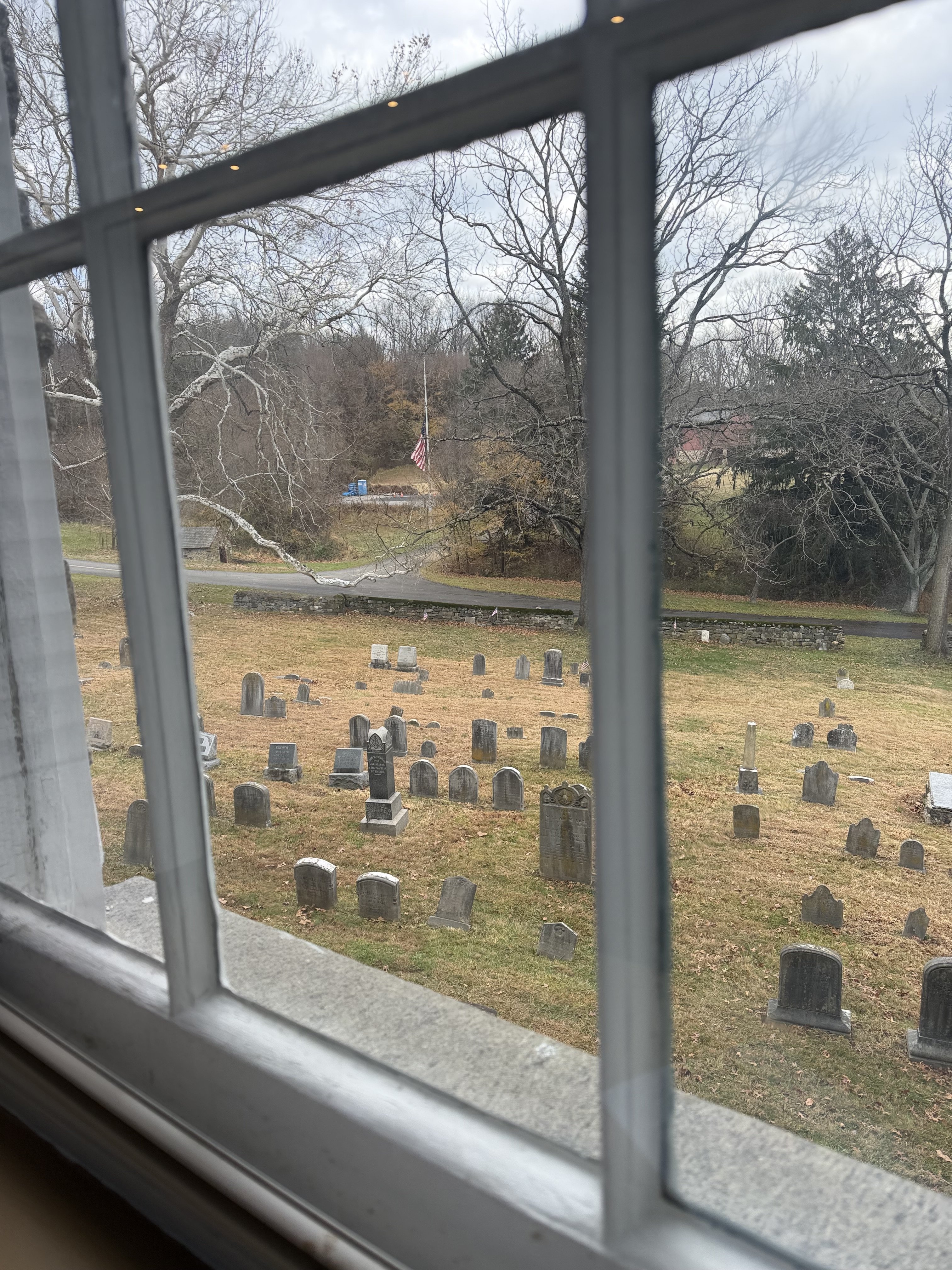 View this morning out one of the windows of my church. It was founded in 1694. Some of the cemetery headstones are Revolutionary war dead from 250+ years ago in the Battle of the Brandywine.
