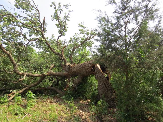 Looks straight forward to me. Just cut the far side off and let it fall Or hold it with your FEL, then the only thing left is what is from the trunk to the far side of the BH you have just cut. Should be able to hold that even with my wimpy 300 JD FE loader. You can't break what is already broken, as my dad would say.