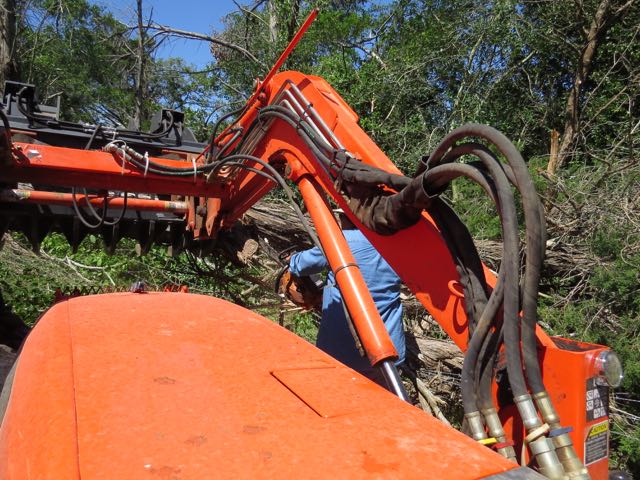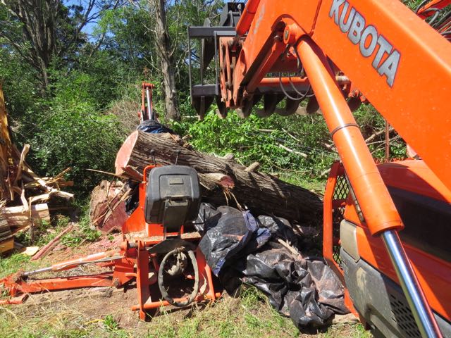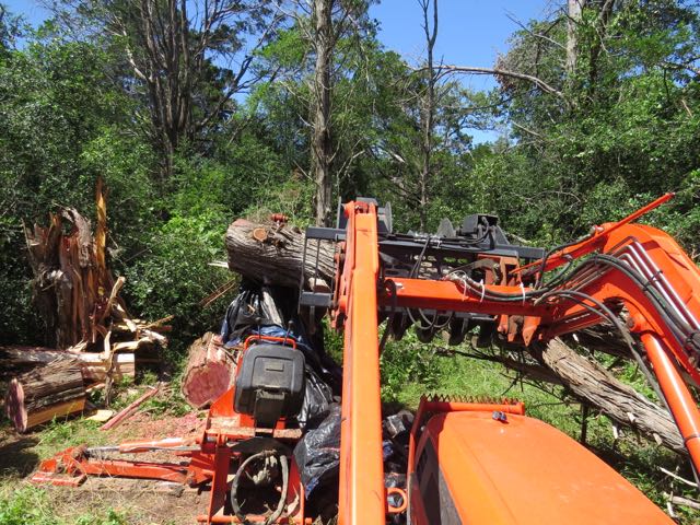 Well, we almost got it off without damage but the main trunk slipped out of the grapple. The rod is bent from the initial fall and a hydraulic hose was knocked off during the removal of the tree I won't be able to see any other damage untill the hydraulics are back so I can install it on the tractor.