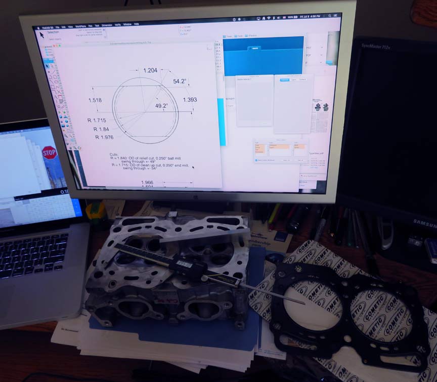 Made up some drawings for machining the Subaru cylinder heads after lunch. It seems that using 2.2 liter heads on a 2.5 block results in too much compression, so a bit of metal needs to come out of both the heads and the pistons. I'm doing the heads, while the mechanic has tooling to enlarge the valve pockets on the pistons. But making a drawing will help ensure that the cuts are made correctly the first time, even though I have a scrap head to practice on. We'll also use that head to figure out how much material is left between the bottom of the cuts and the water jacket inside. We'll find that out by milling down through the cuts until we hit the passages. None of this would be necessary of the California Air Resources Board just used emissions tests to approve engine swaps, but instead they've institute a grueling list of requirements that have nothing to do with clean air. Worse, apparently those in charge of approving variants are somewhat capricious in their decision making, and spending thousands to build up a motor may not result in a green light even though what comes out of the tail pipe is clean as the driven snow. So this Frankenmotor will have bits chosen to meet what's already been approved, not for either performance or clean air.:confused2:
