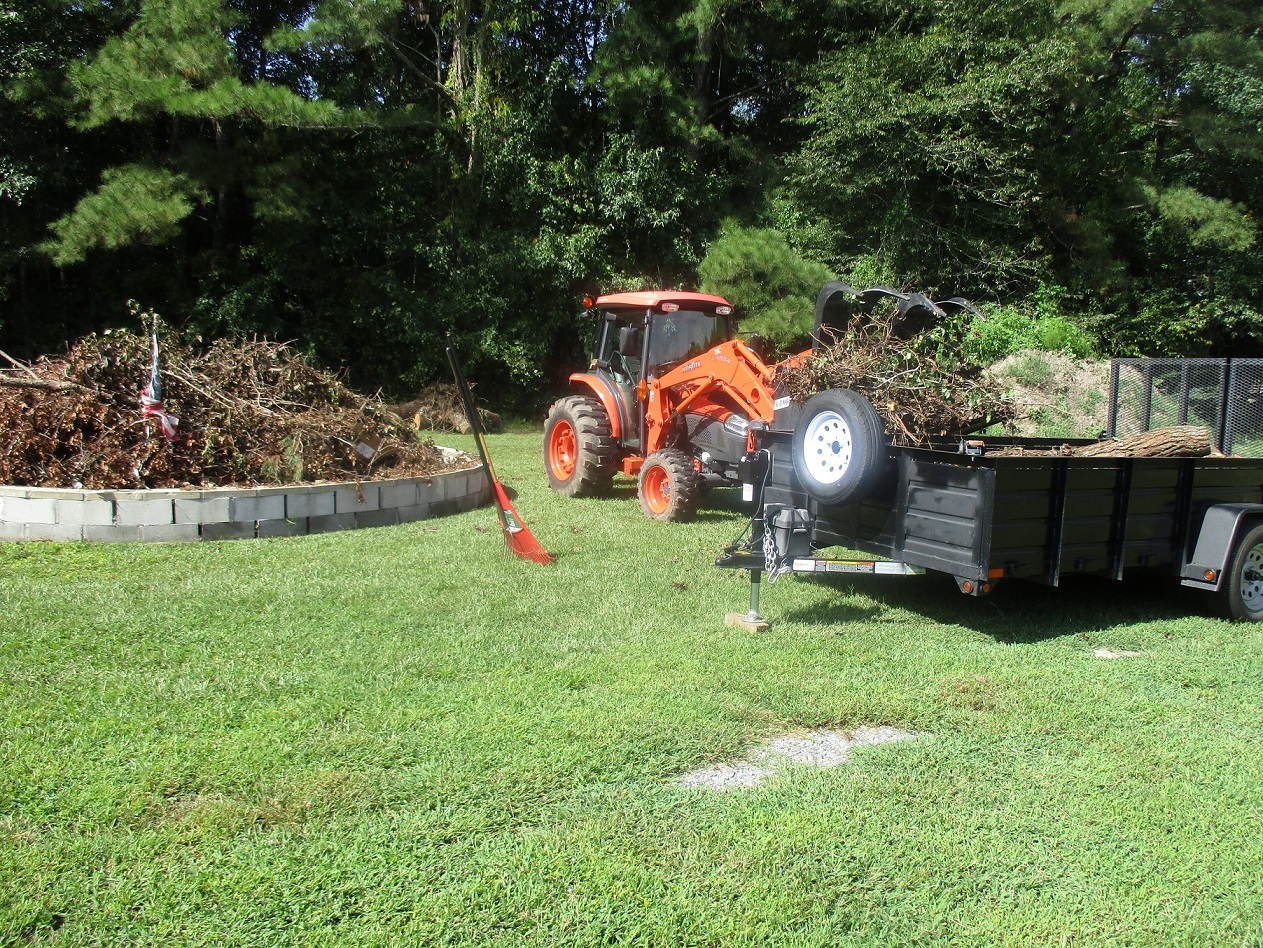 got some seat time on both tractors, here is the result of the tree mess. Four trailer loads so far, just the trunk and three logs left to deal with.