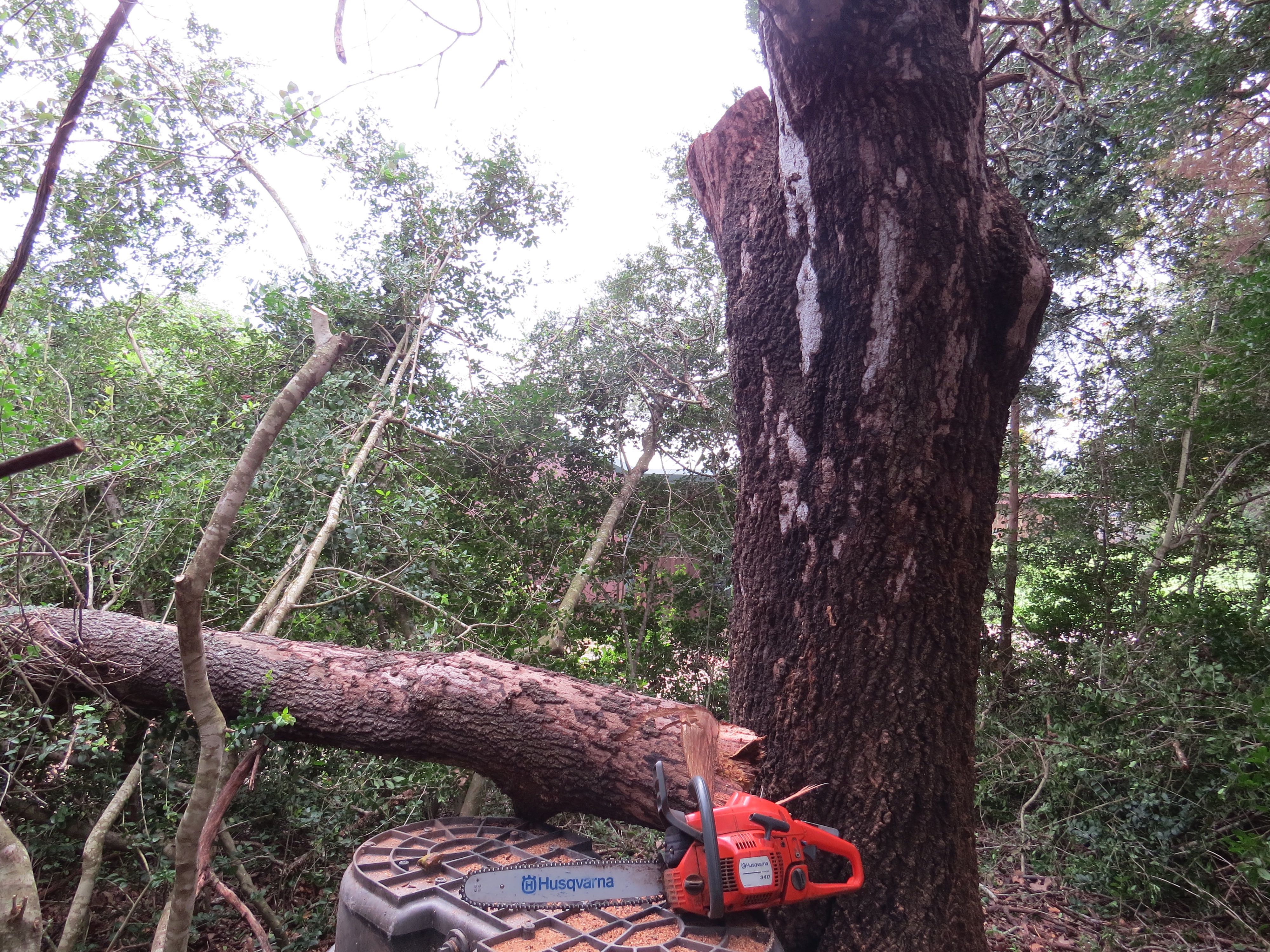 Ok, today I'll take down the limb. I cleared out around the tree and put in a platform (upside down water trough). The limb is about 8' high where it connects to the trunk and 14" diameter so the harbor freight 8" pole saw can't be used.