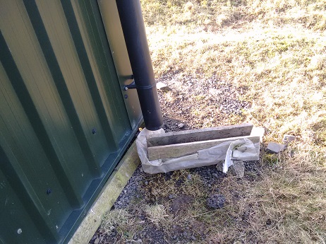 A few of the heavily pregnant ewes that are slowest on their feet are in a little compound that surrounds my far barn. I had to straighten my "temporay fix" water pipe diverter that one of them had kicked away.