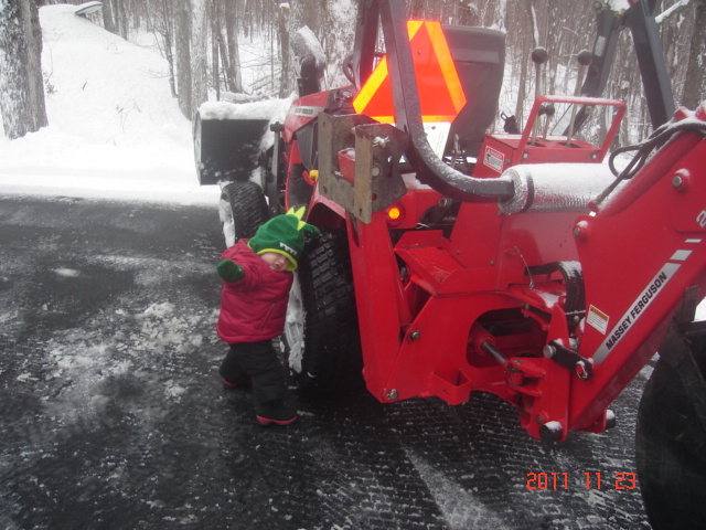 We ended up with a good 12", but it was wicked heavy! Here's some shots of the "after" pic of the driveway, along with the 2nd grandson. He seems to be quite taken with tractors.... don't know WHERE he gets that from!:laughing: