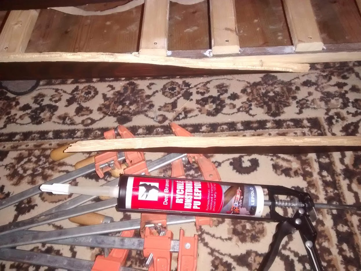 The older two kids a couple of days ago figured out it was fun to jump off their bunkbed onto the other bed below. I told them to stop. They did it again today, which added to my problems. A wise man at Highland Hardware in Atlanta once said "you can never have too many clamps". I would add that fast curing polyurethane wood glue is another must-have on hand at all times (and in fact it can stick many other materials).