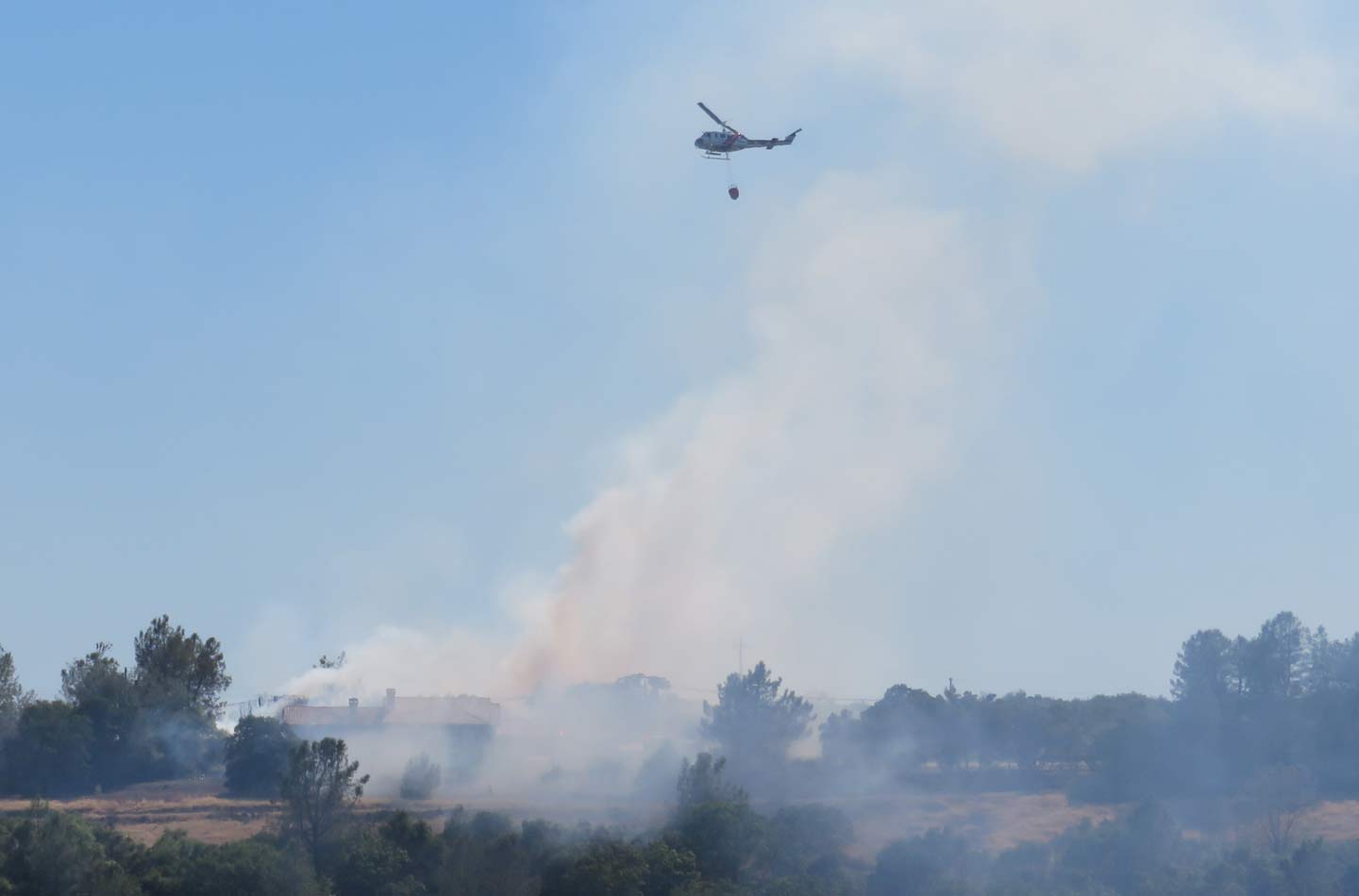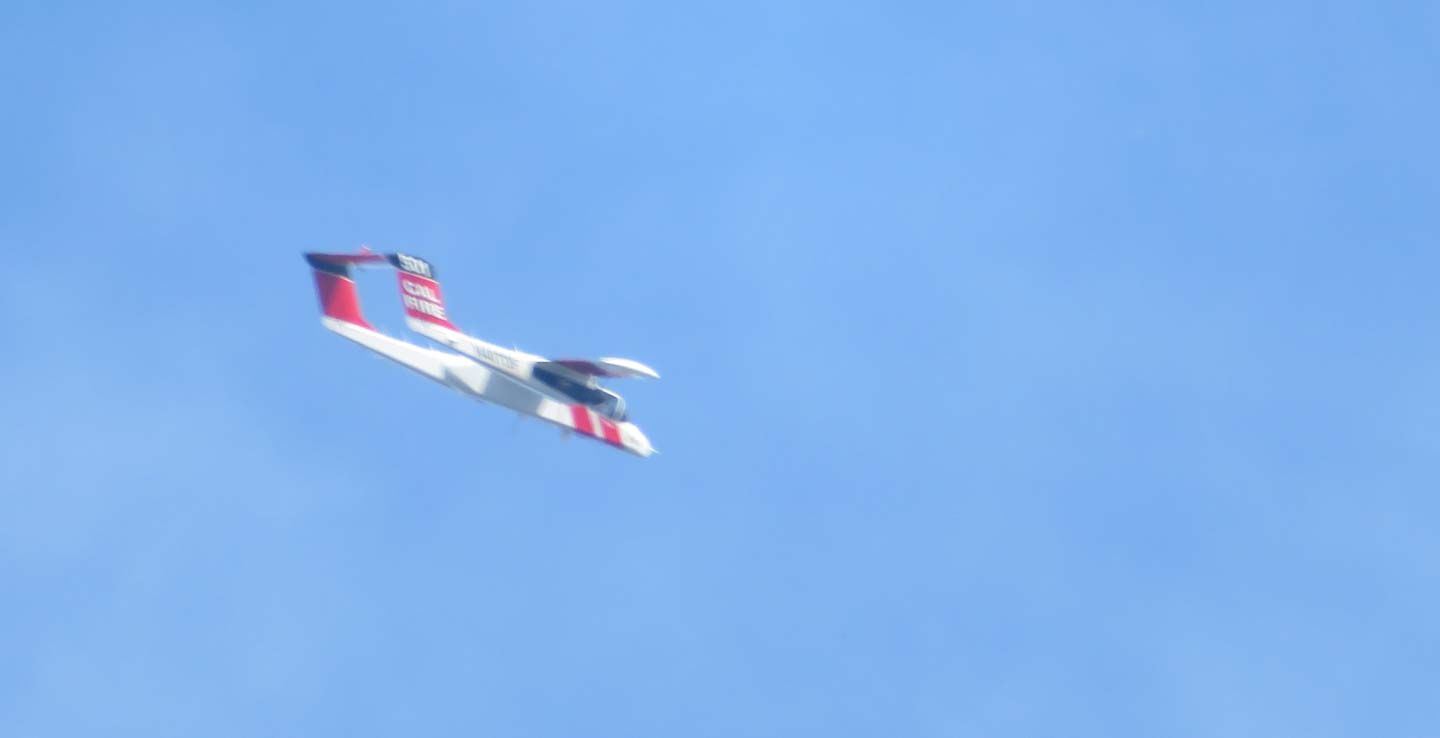 Just across the canyon a very large house was almost covered by a thick shroud of smoke, and a helicopter dragging a water bucket hovered overhead. I watched as it dumped it's load, but not on the house. Then back to the reservoir to fill up again, then it just circled the house. A borate bomber plane also began to circle but held off on a run, all this while an OV-10 spotter plane kept an eye on things. The Butte County Safety Scanner page on Facebook told me it was a grass fire that had been stopped before it reached the house, but it was a close thing. Close to here, too, only 3/4 mile away. But 1000 feet of that were bare canyon wall and water, so unless an ember managed to float that far, I was still relatively safe. About that time the phone rang and it was my bulldozer neighbor, who lives another two miles to the east, asking if I'd seen the fire. He'd been watching it since the beginning, as his property is much higher and he has a view looking down on that location. He said that a burnt manzanita leaf had fallen in his yard, so I think we can all be grateful that the fire didn't spot over the lake and take off again. Took them less than half an hour to stop the flames from spreading; very good response from a fire service that has been heavily criticized in the past. Here's the incident log from Facebook: