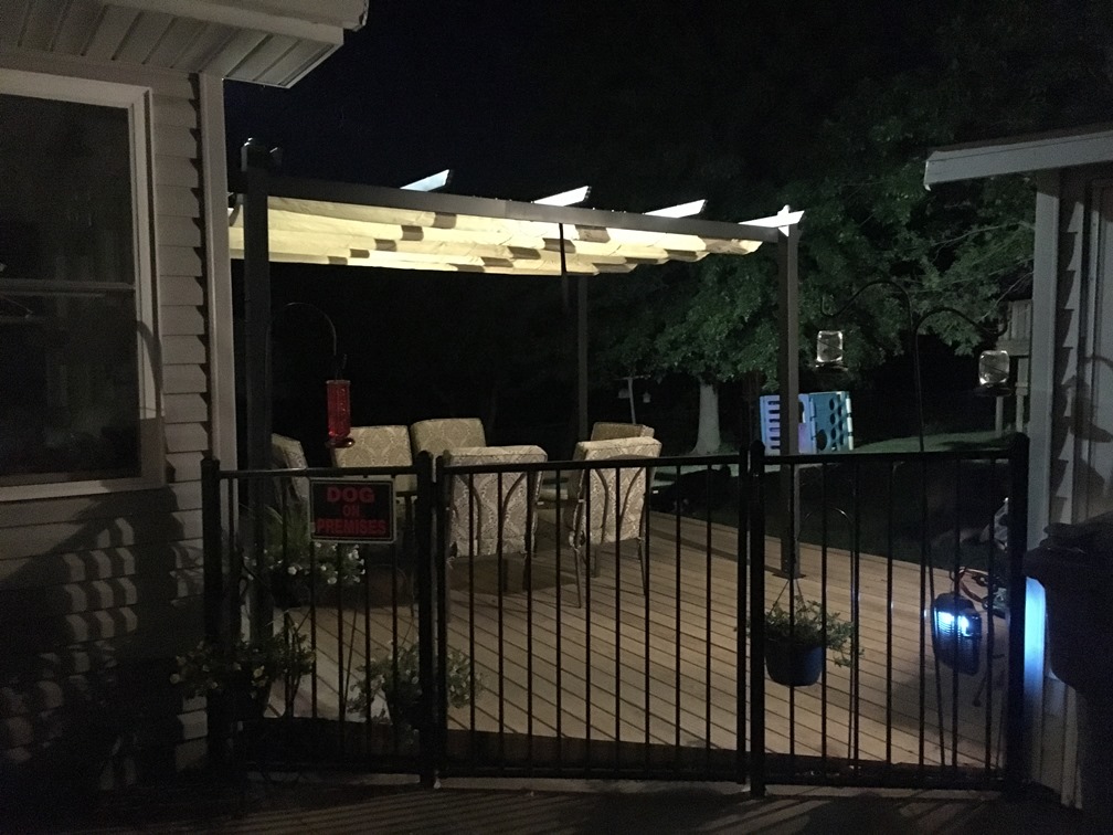 Wife got home from the dog show about 6pm yesterday, and decided we should erect the new 10'x13' pergola on the deck. So, of course, we did. Took the two of us about three and a half hours, but we got it finished. It has a retractable shade, and is surprisingly more stout that I'd anticipated for something that came in a box and screws together. Not a great picture, but it was 9:30 at night, and the backyard flood lights near the top of the sunroom really lit it up. She's pleased, and in the end that's what matters.