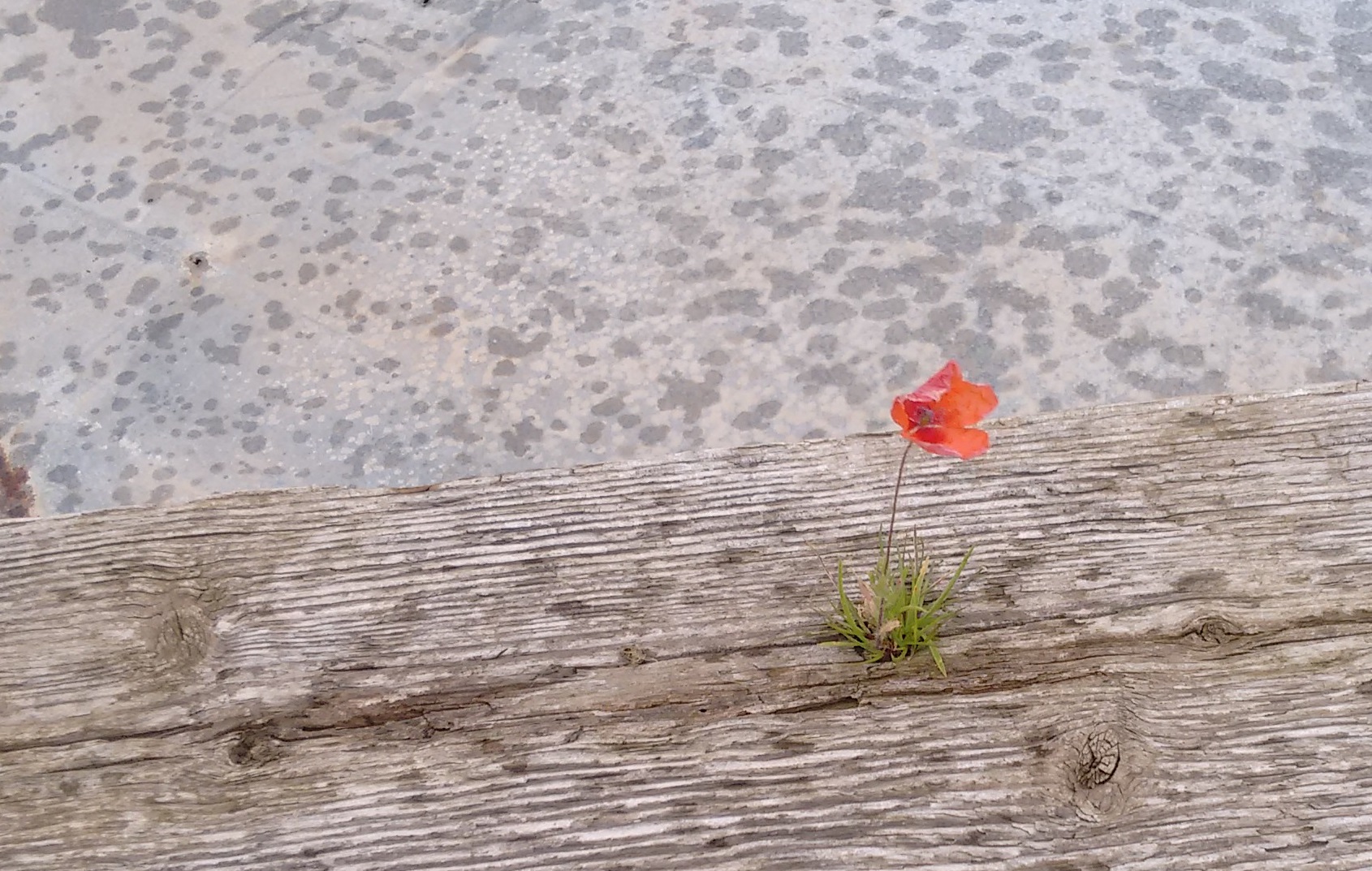 Good morning. Rain arrived half an hour ago. I heard the first few drops pinging onto some old tin sheets and when I looked down, noticed this tiny poppy, which has somehow managed to germinate and grow in a piece of wood that is weighting the sheets down.