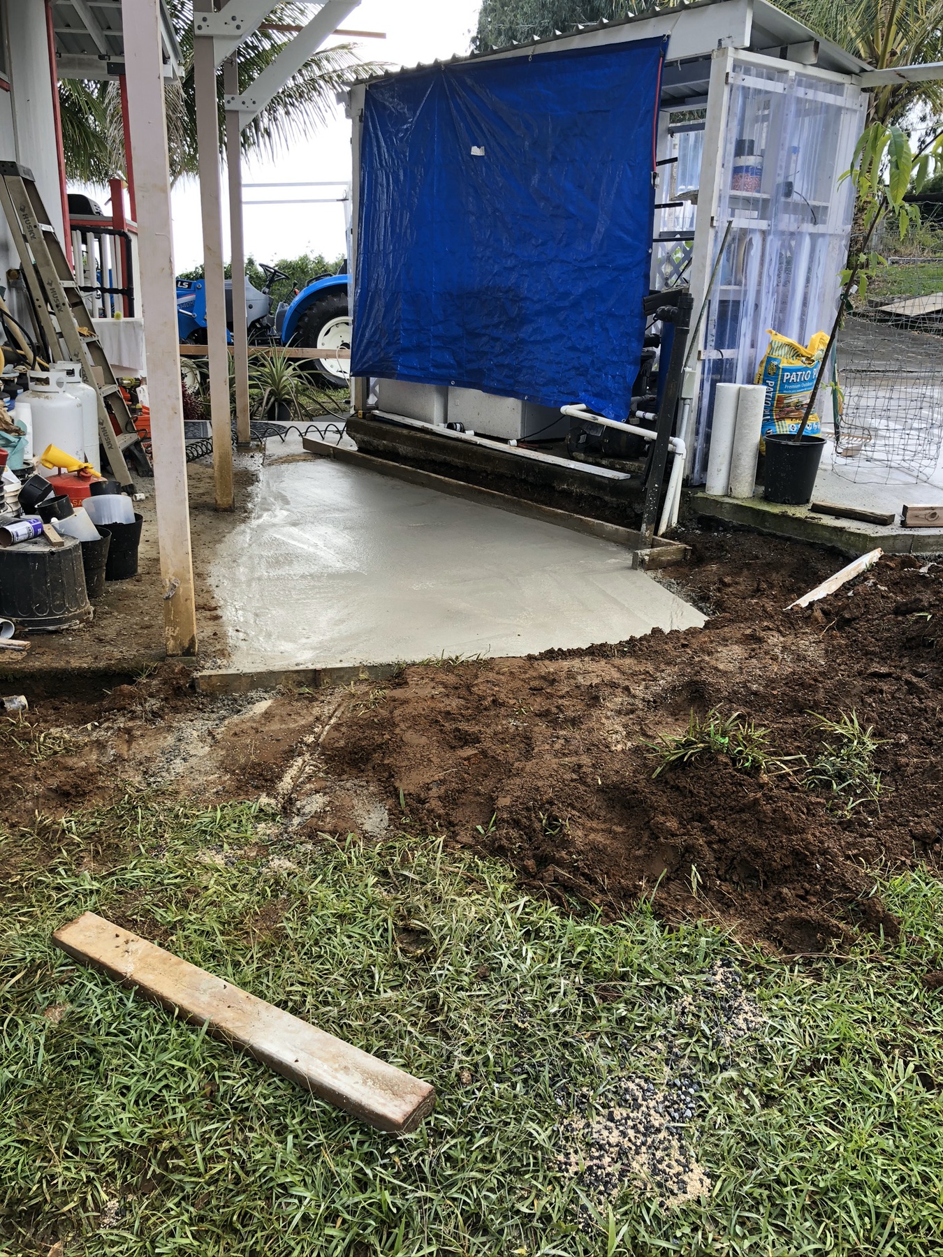 28 bags mixed and finished. Not George perfect, but entirely adequate I suspect. Fortunately, my younger neighbor Mike came down and help. What a worker, took us about 2 hours, no breaks. Floating concrete isn’t a fine skill of mine, but doesn’t look bad.