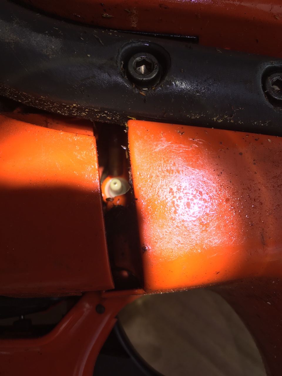 Found the chain saw leak pretty fast once I got the flashlight. The hose fell off the orange knob, the white one is the tank breather. Fixed and time to spare so I trimmed the hedges and promptly got stung by two wasps- I though I left those in the country.