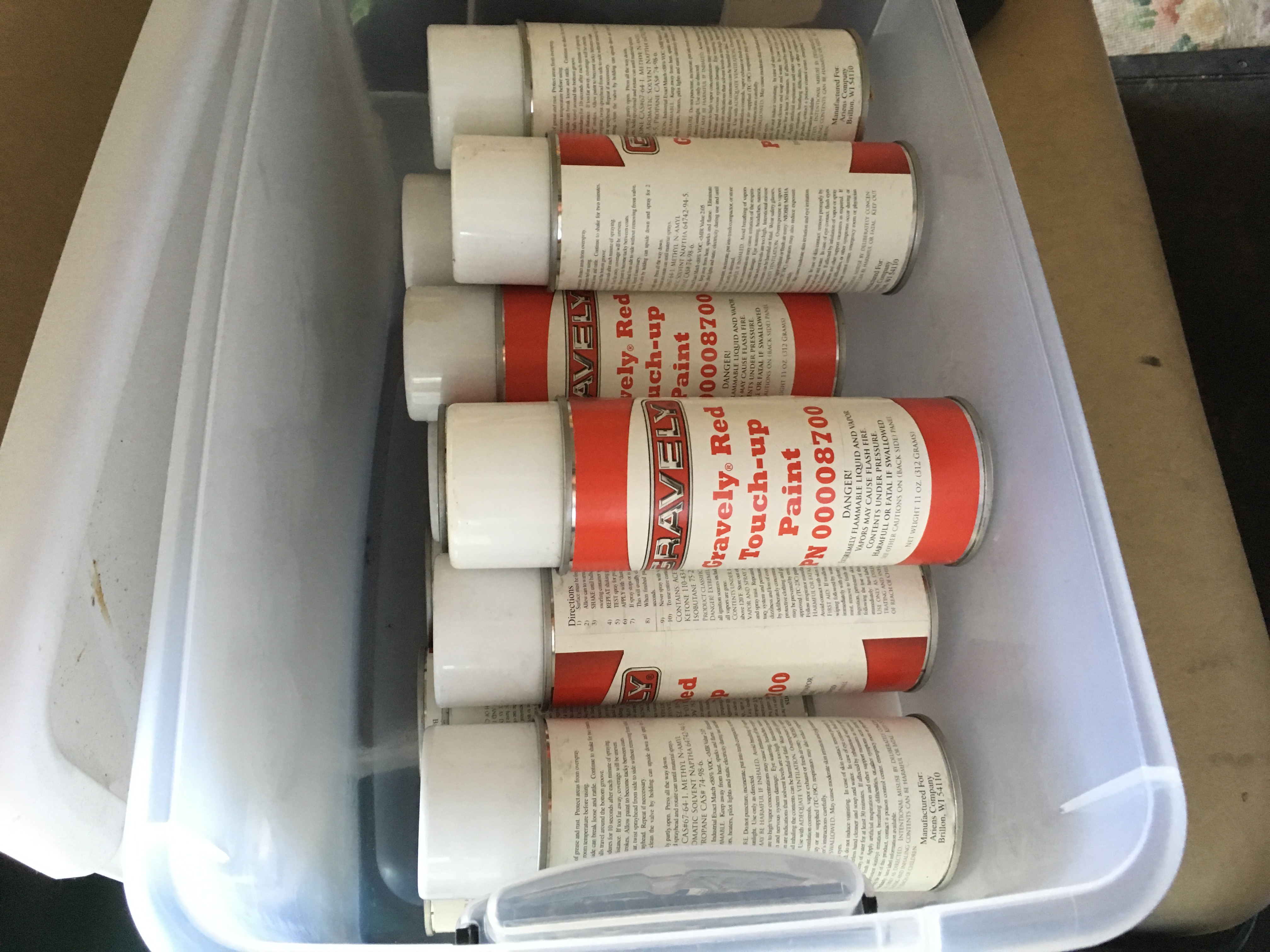 A plastic container with 18, I repeat 18 cans of oem Gravely red paint.