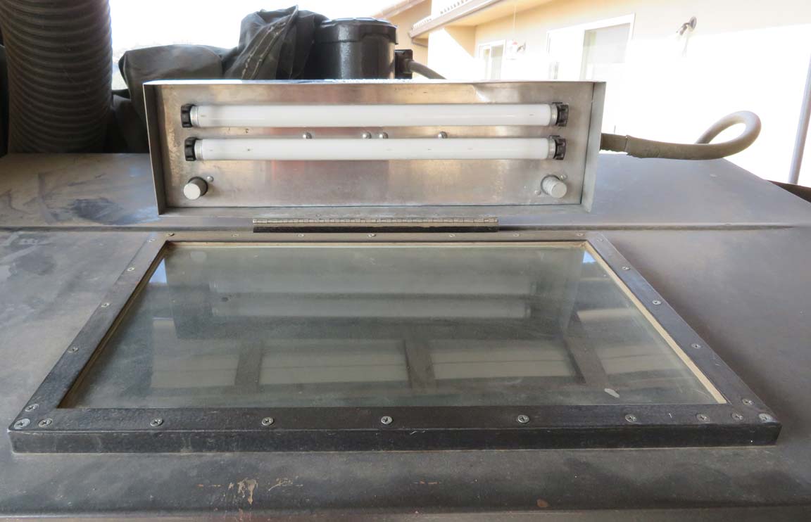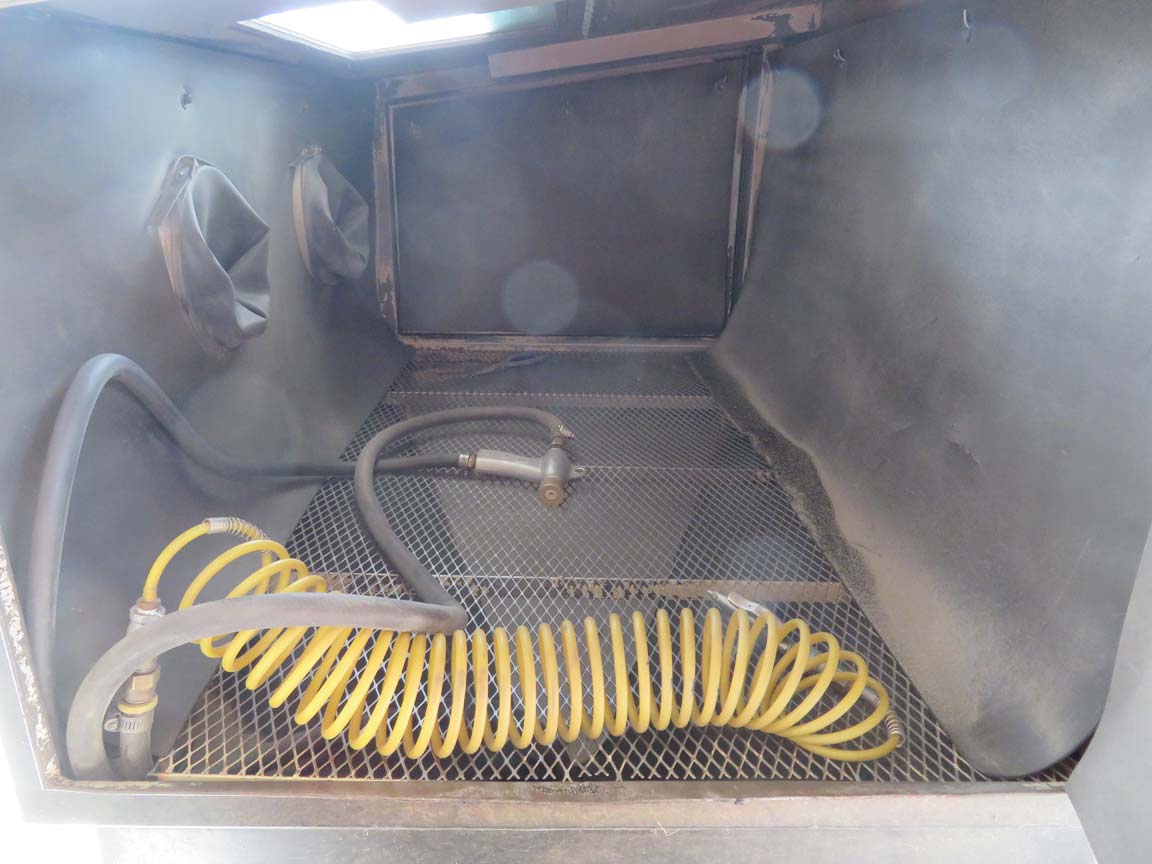 We had a pair of blast cabinets at the auto parts stores (two locations) ... they were painted green, maybe Petersen brand. They were 4' or 5' long x probably a little over 2' deep ... clamshell design ... top opened up and rolled back to a 45 degree angle. They had an additional tall cabinet (6' ?) with six inverted filter socks in it to filter the air and remove the dust.